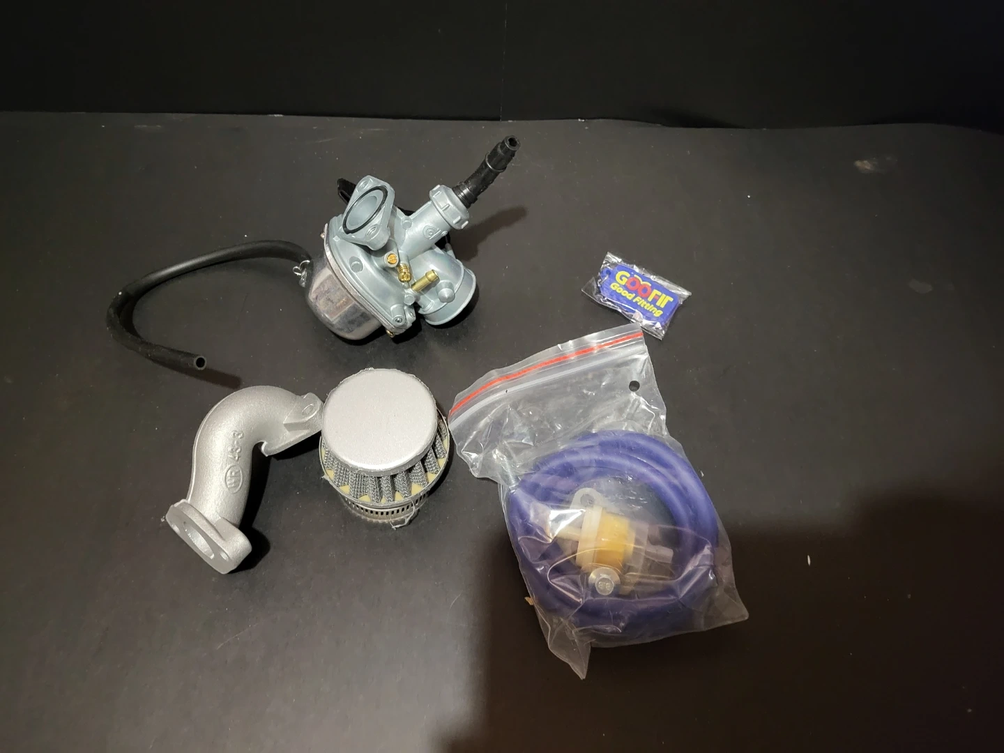 This is a carburetor kit. It includes a carburetor, an intake manifold, an air filter, and a fuel line with a filter. I had a 90 cc bike a while back to fix. Its long gone and I had lost this at the time so it was never used.