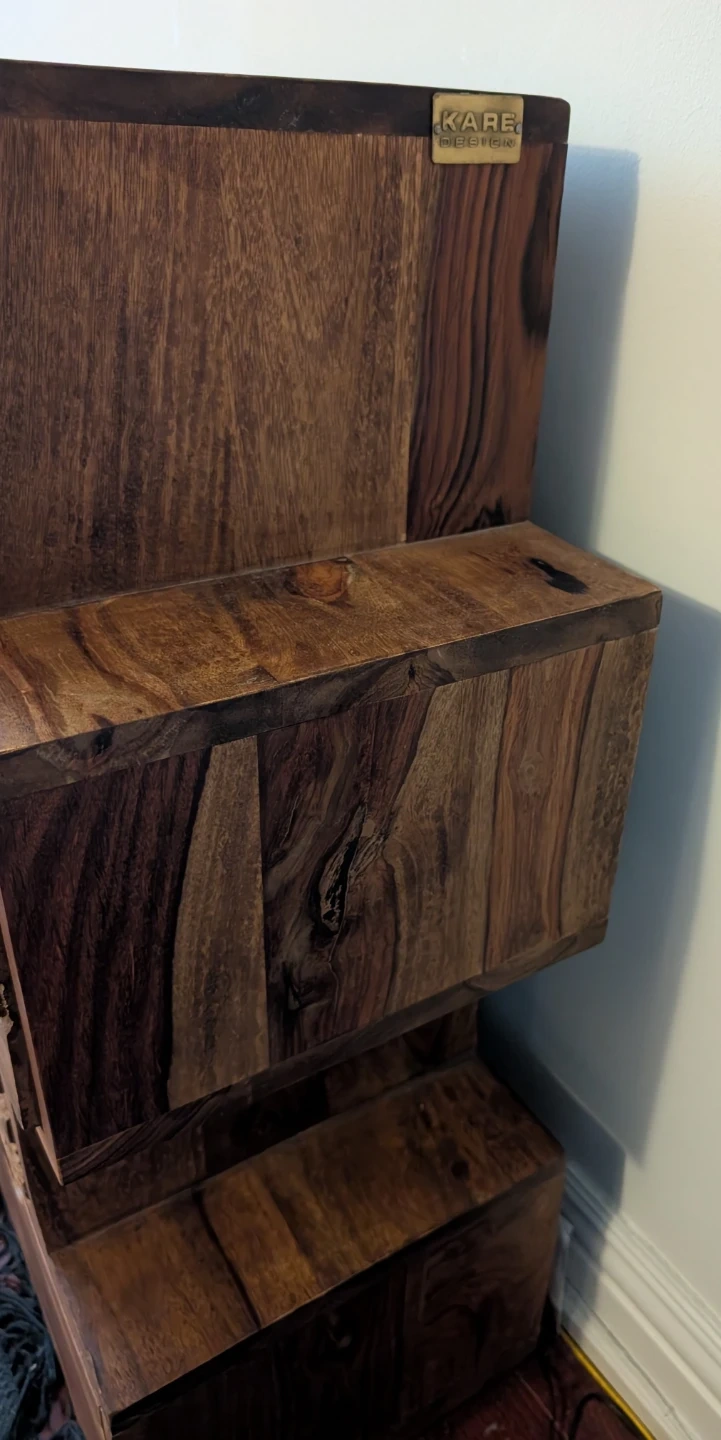 This unique piece is part of the Rodeo collection from KARE Design, from their popular Rodeo Zick Zack (Zig Zag) series. These pieces are known for their "rugged charm," using solid mango wood, genuine cowhide, and hand-carved details.