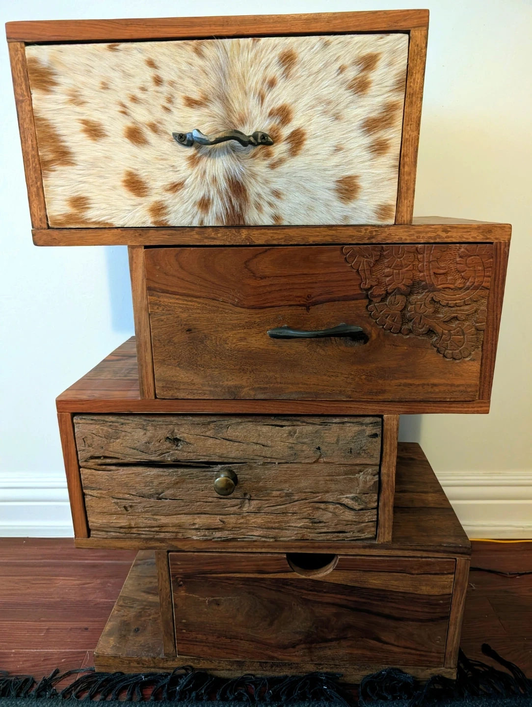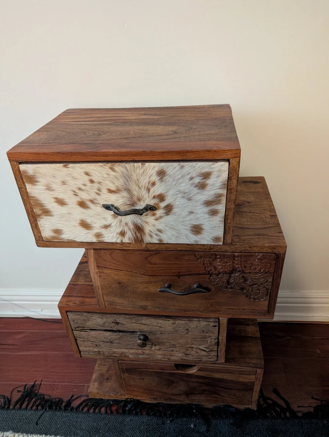 This unique piece is part of the Rodeo collection from KARE Design, from their popular Rodeo Zick Zack (Zig Zag) series. These pieces are known for their "rugged charm," using solid mango wood, genuine cowhide, and hand-carved details.