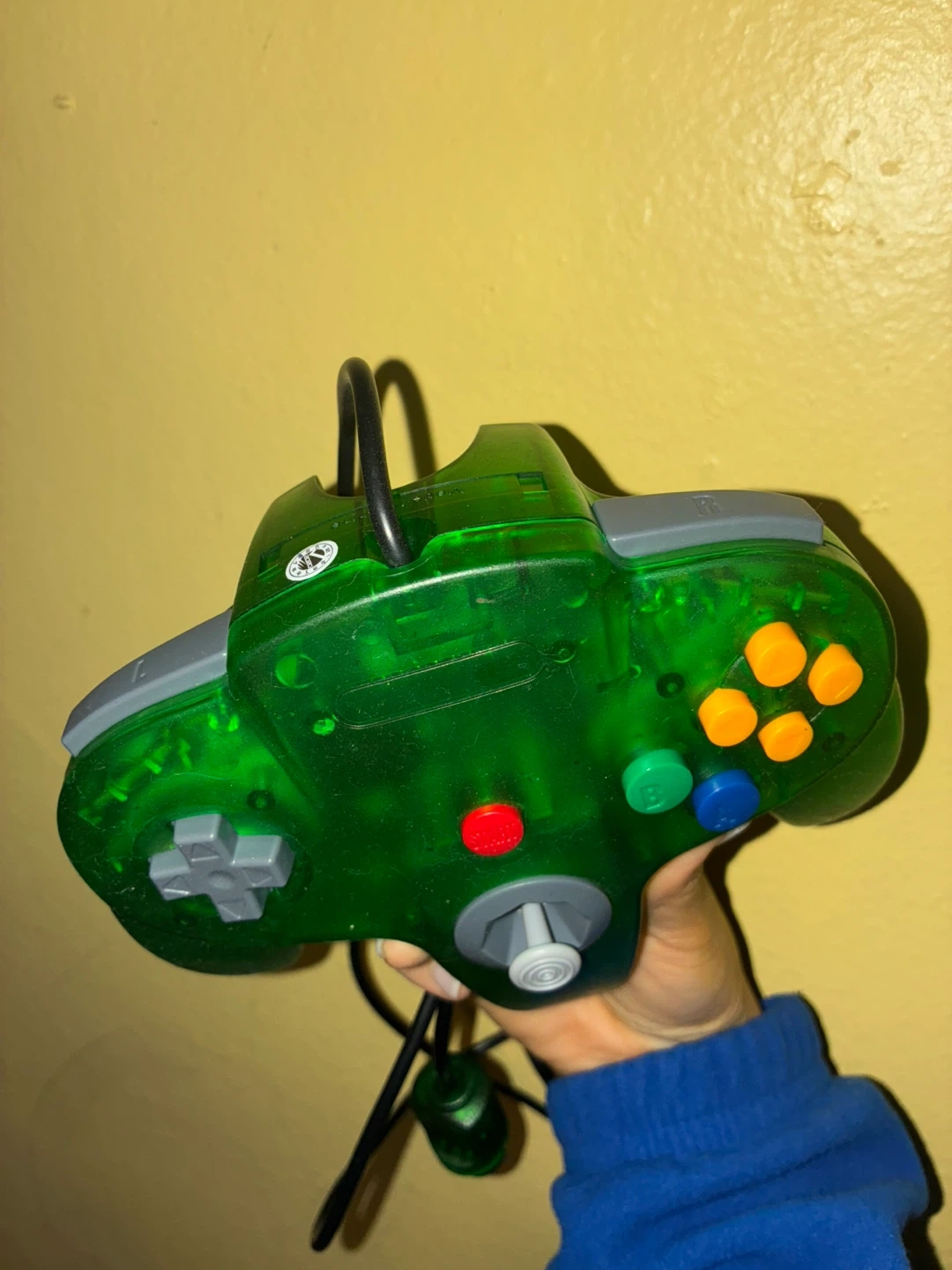 This is a translucent green controller for the Nintendo 64. It's compatible with the N64 console and features the standard button layout. Great for replacing a lost or broken controller!