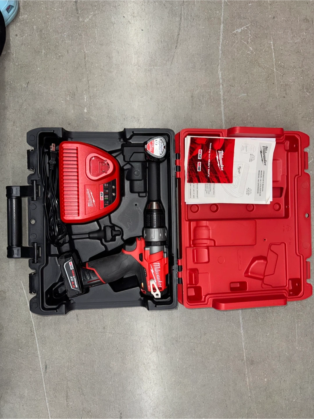 This Milwaukee M12 FUEL cordless drill kit includes the drill, a charger, and an XC 4.0 lithium-ion battery. It also comes with a variety of drill bits and accessories in a red carrying case. It's a great set for various DIY projects and household repairs!
