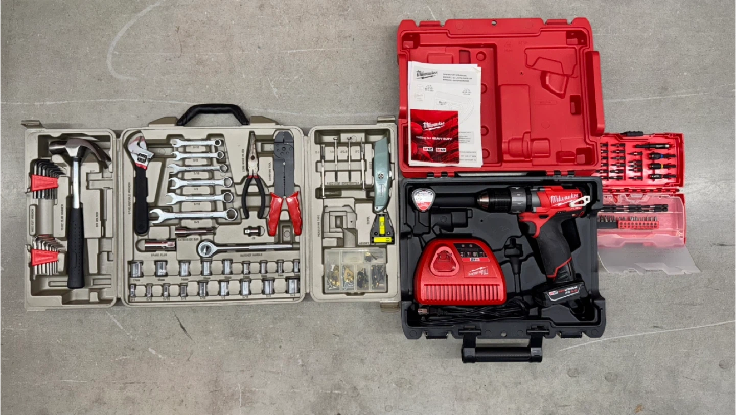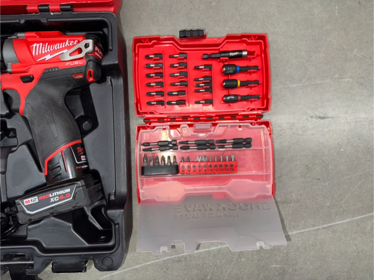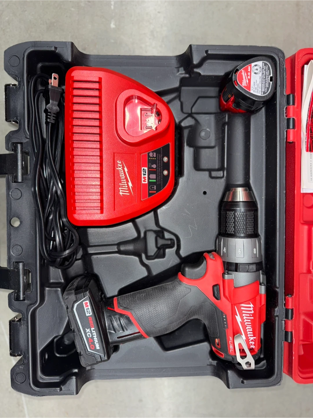 This Milwaukee M12 FUEL cordless drill kit includes the drill, a charger, and an XC 4.0 lithium-ion battery. It also comes with a variety of drill bits and accessories in a red carrying case. It's a great set for various DIY projects and household repairs!