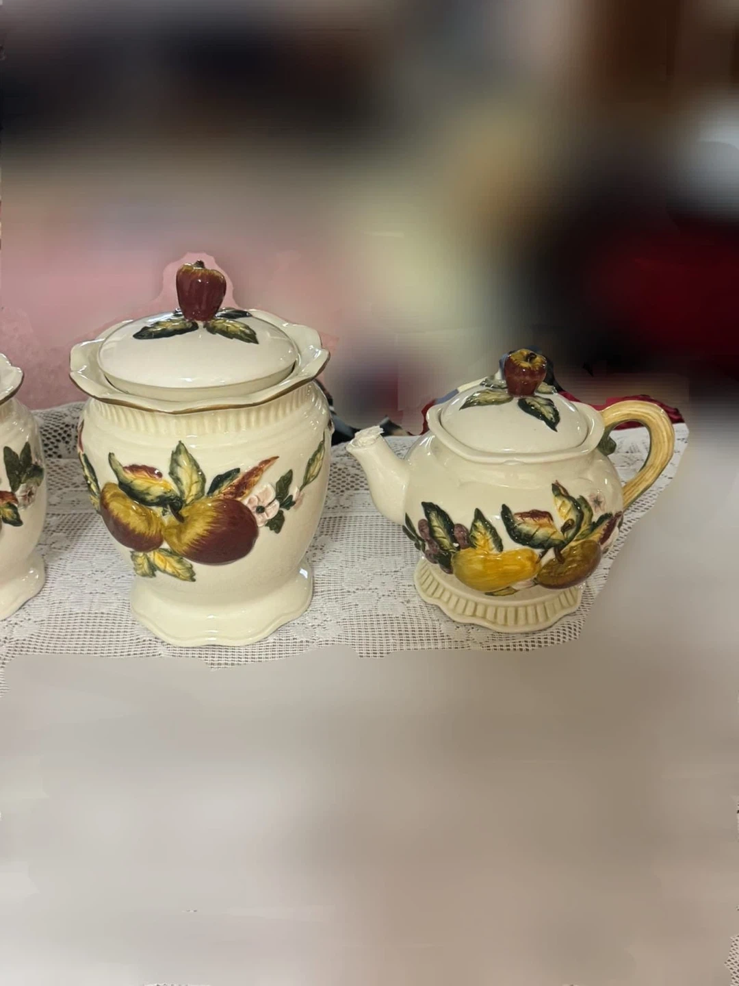 A set of four decorative ceramic kitchen canisters. Features a lovely fruit and grape design with ornate lids.