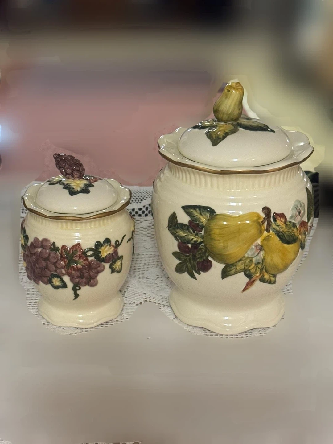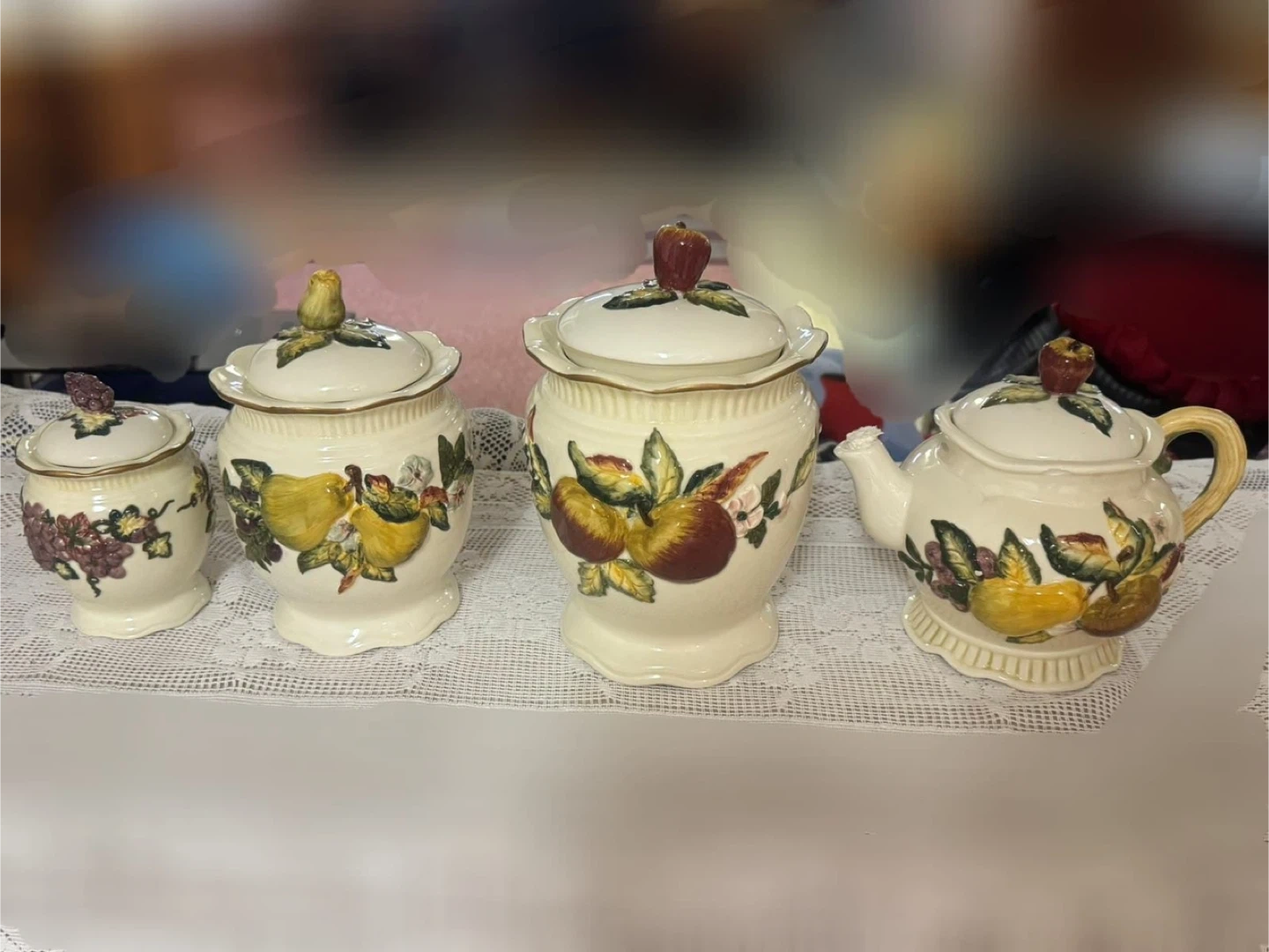 A set of four decorative ceramic kitchen canisters. Features a lovely fruit and grape design with ornate lids.