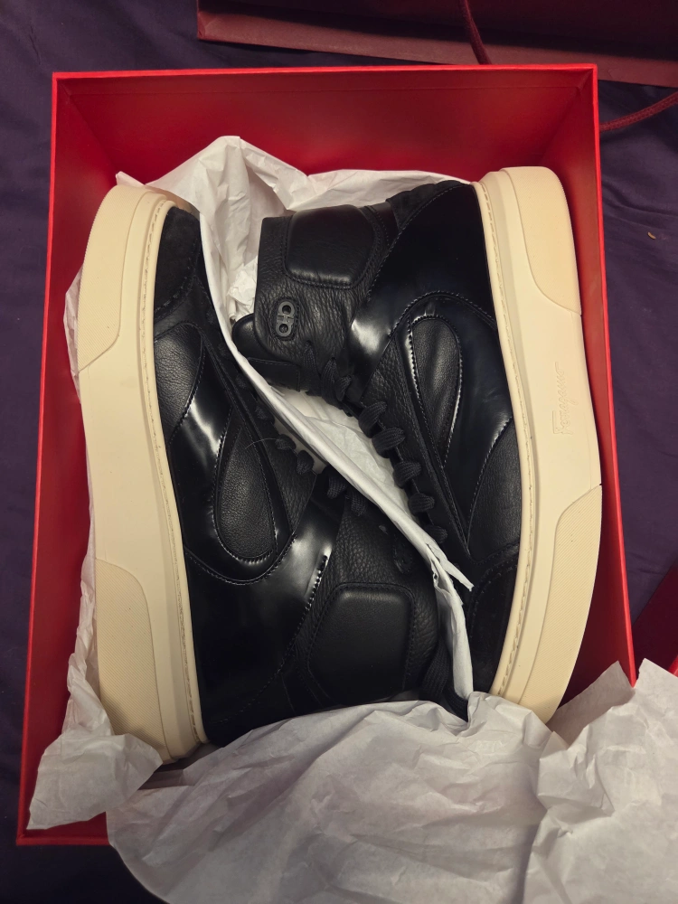 Authentic Salvatore Ferragamo high-top sneakers in black leather. Size 11. Made in Italy. Includes original box, dust bags, extra laces, box and bag. Brand new never worn.