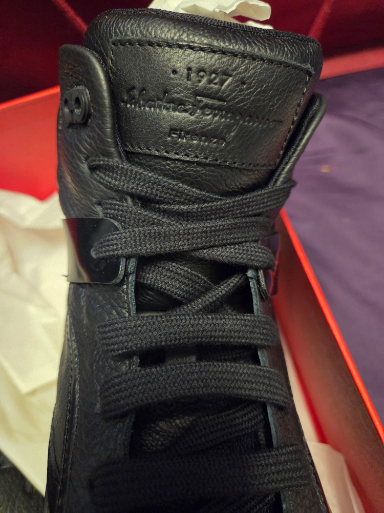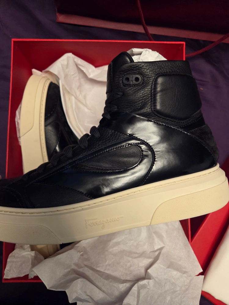 Authentic Salvatore Ferragamo high-top sneakers in black leather. Size 11. Made in Italy. Includes original box, dust bags, extra laces, box and bag. Brand new never worn.