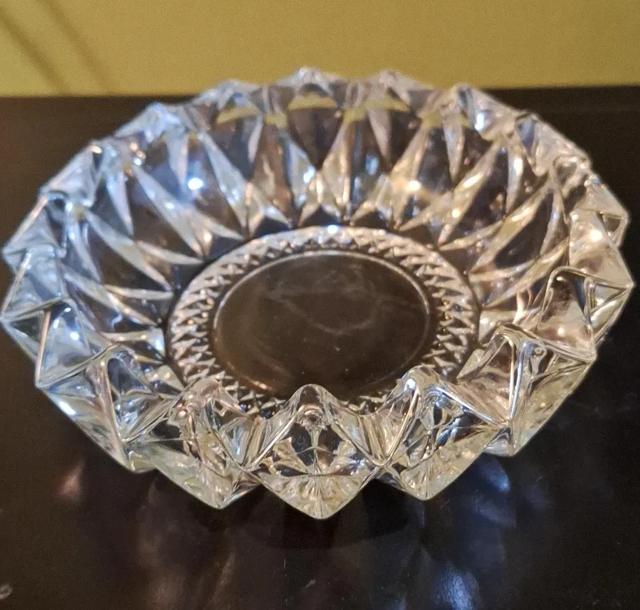 This is a vintage crystal ashtray. It features a faceted design and a clear glass finish. It's perfect for holding cigarettes or as a decorative piece.