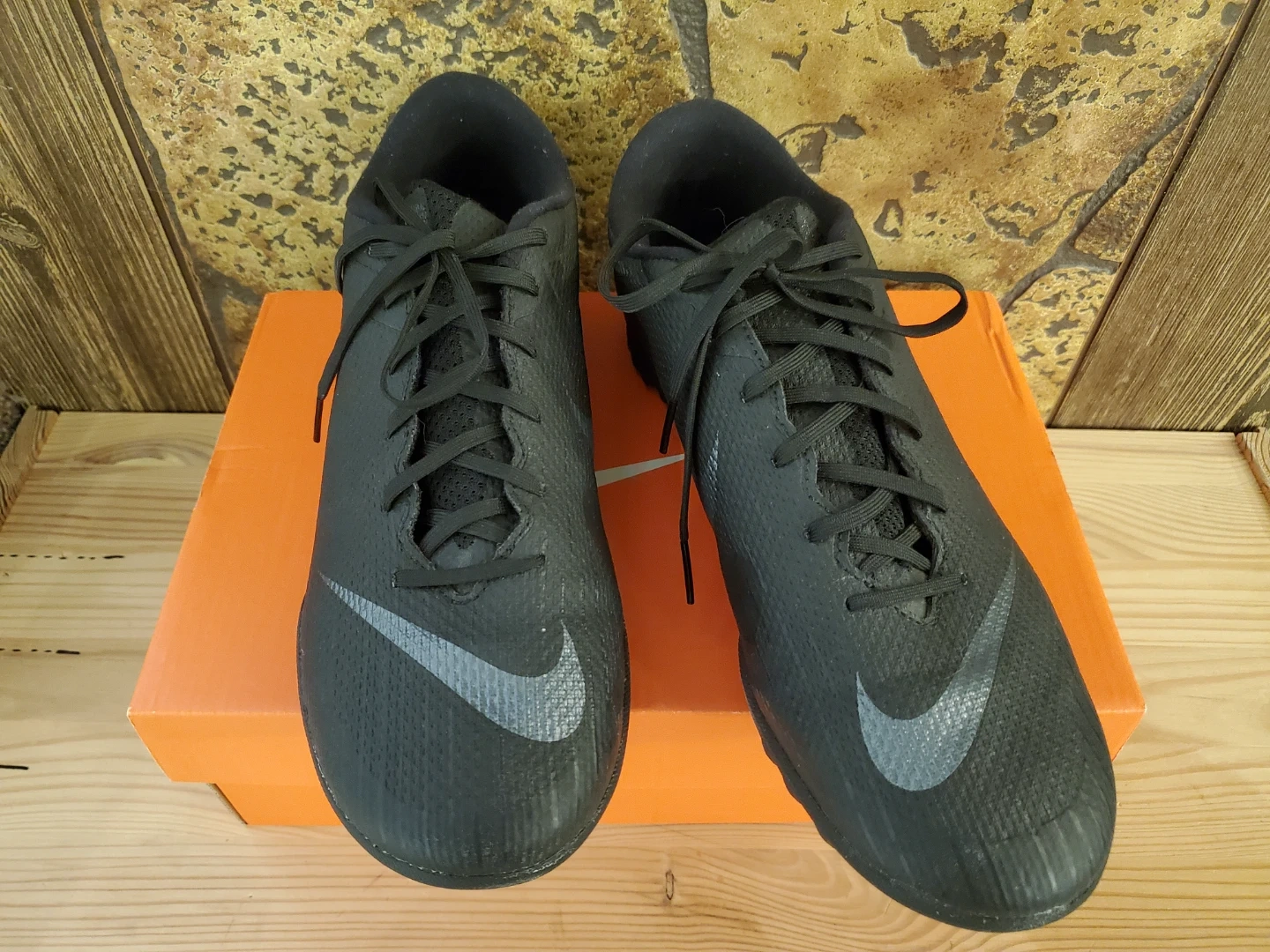 These black Nike Mercurial Vapor 13 Academy soccer cleats are designed for turf play. They feature a synthetic upper and a durable rubber outsole with turf studs for traction. The size is US 7.5, UK 6.5, EUR 40.5, and 25.5 CM. These cleats are perfect for young athletes hitting the pitch!