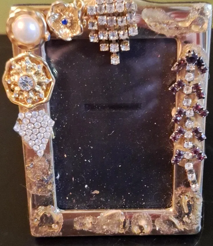 Unique gold-tone photo frame decorated with various rhinestones and a faux pearl accent. It's adorned with sparkling gems for a vintage look! This frame is perfect for showcasing cherished memories.