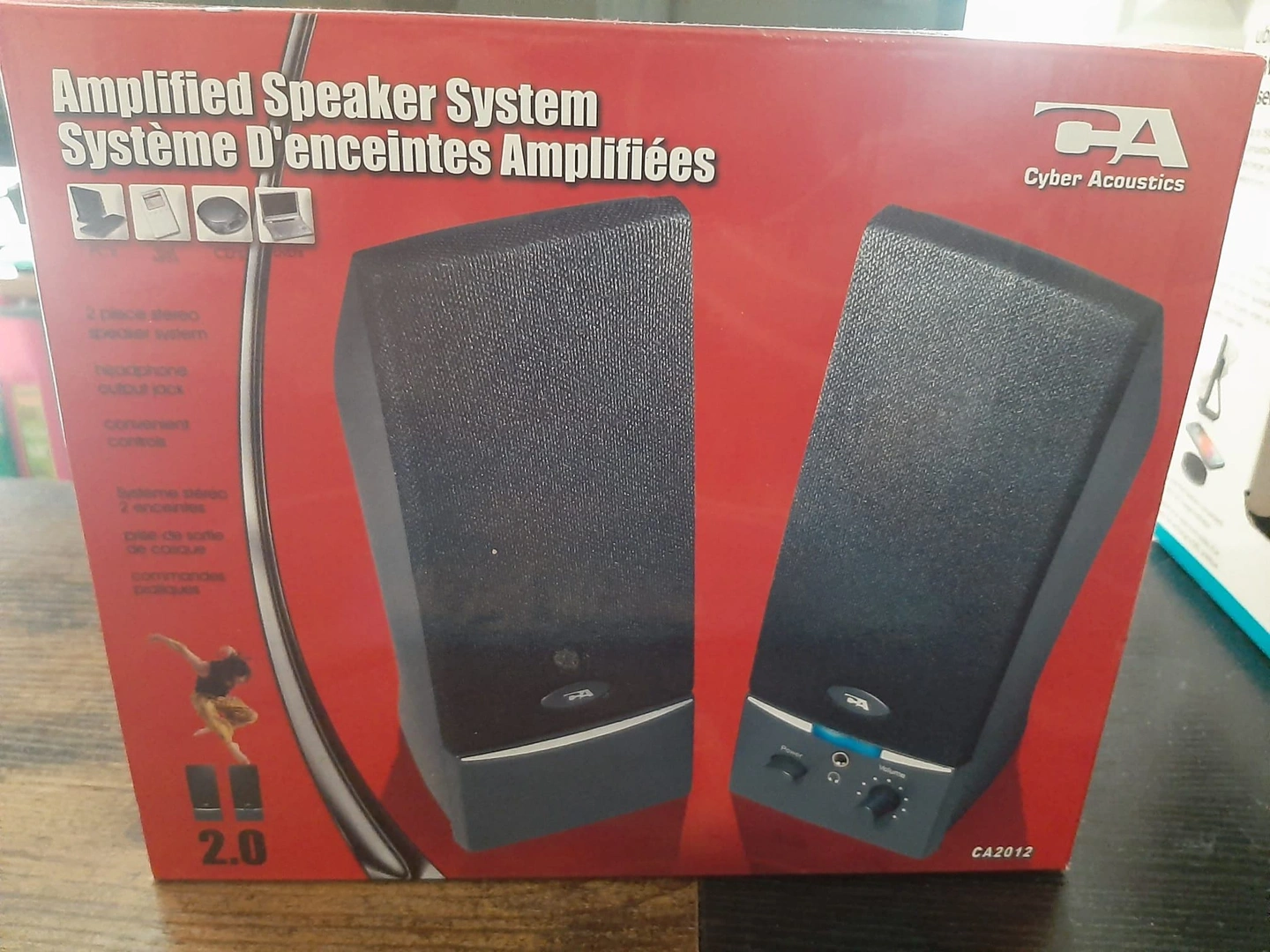 have an open box Cyber Acoustics Amplified Speaker System. It comes with 2 speakers, instruction manual, adaptor, and other accessories.