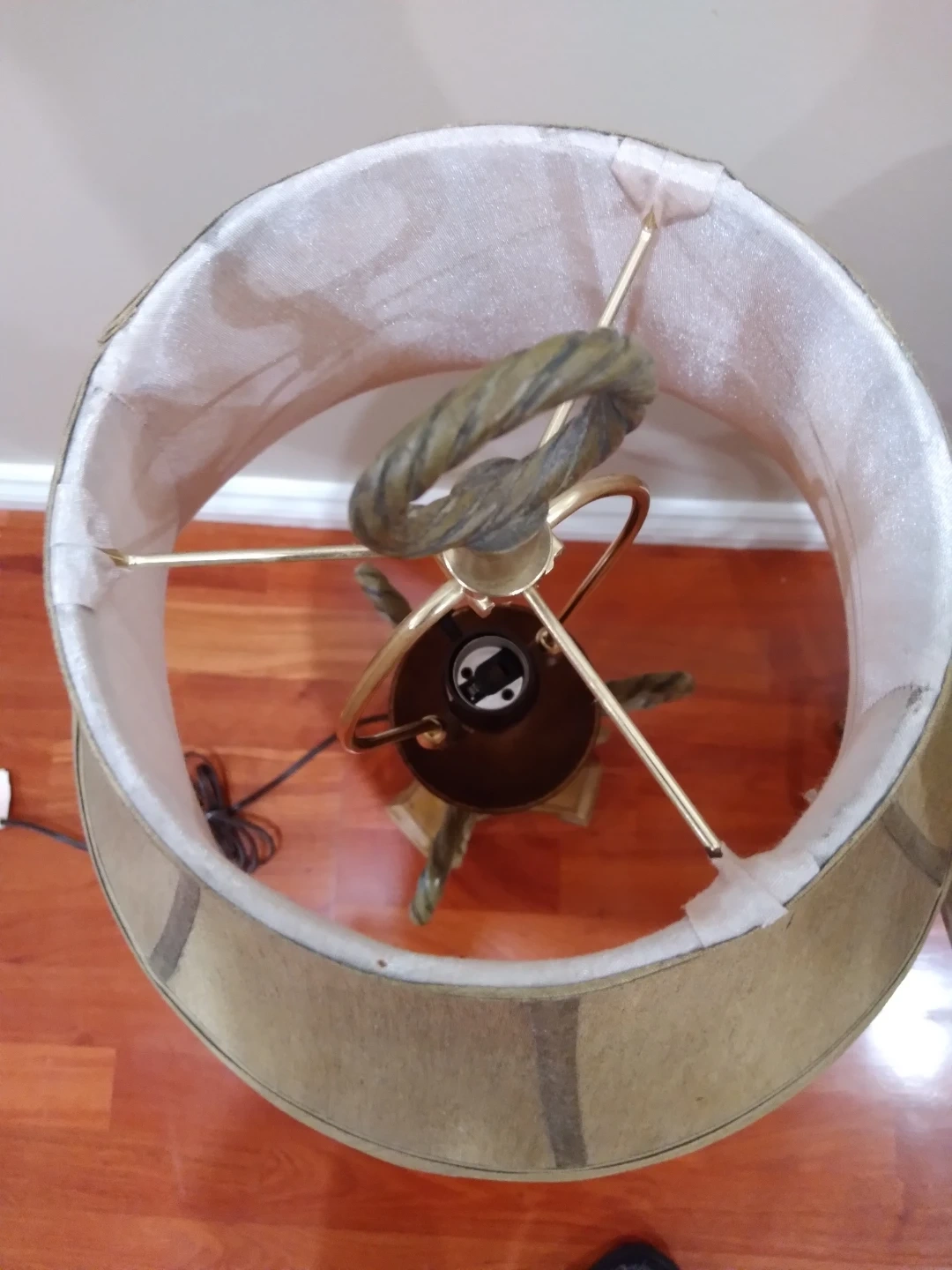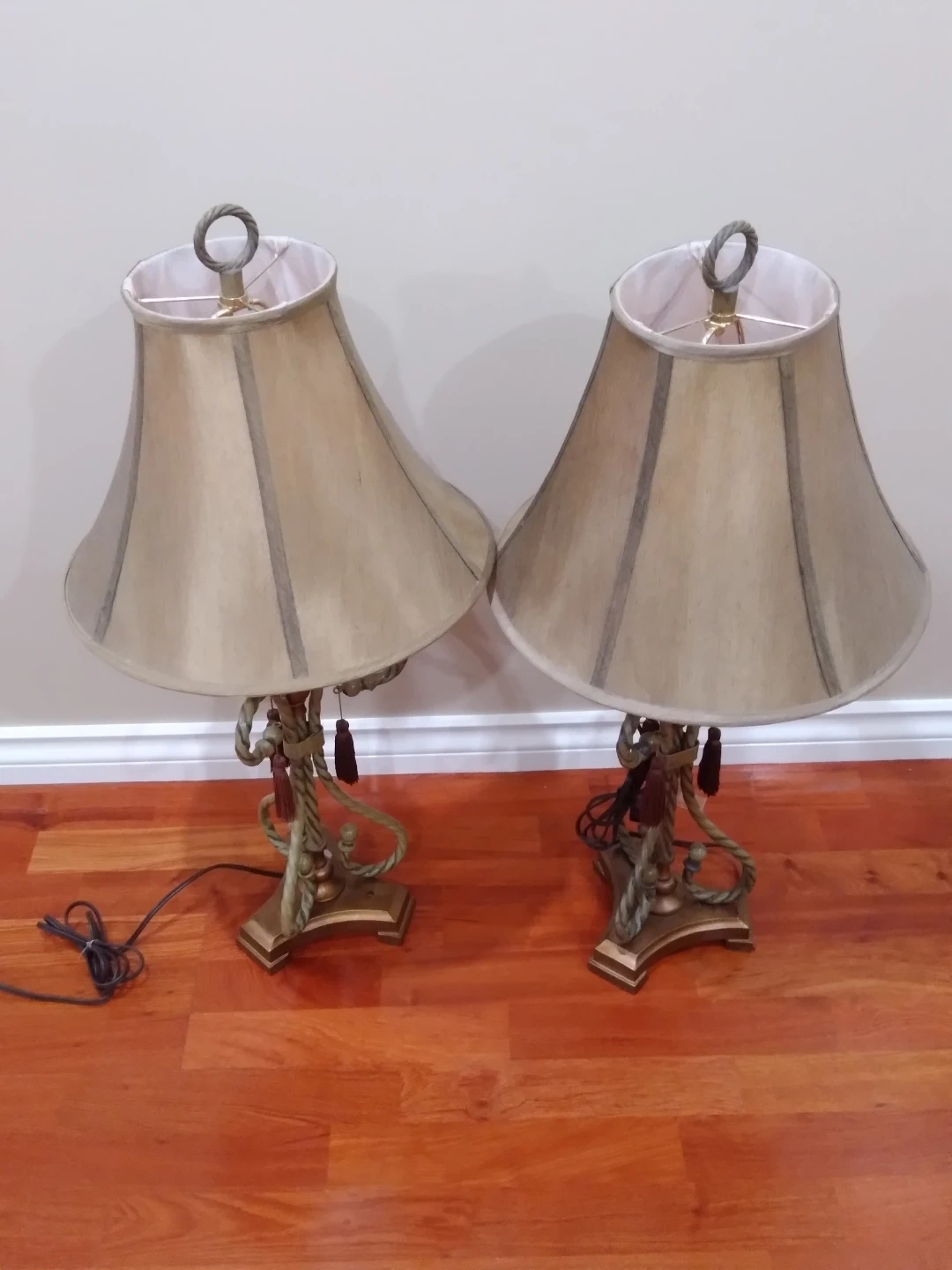 Set of two decorative table lamps. Each lamp features a twisted metal base with hanging tassels and a fabric shade. They'd add a nice touch to a living room or bedroom.