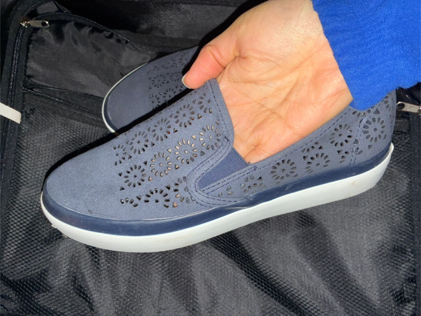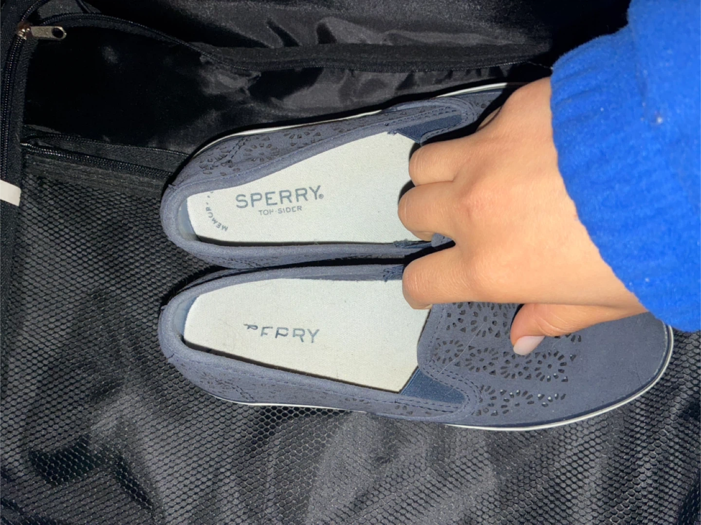 Sperry Top-Sider slip-on sneakers in blue. These shoes feature a breathable perforated design. Comfort insole included. SIZE 7.5