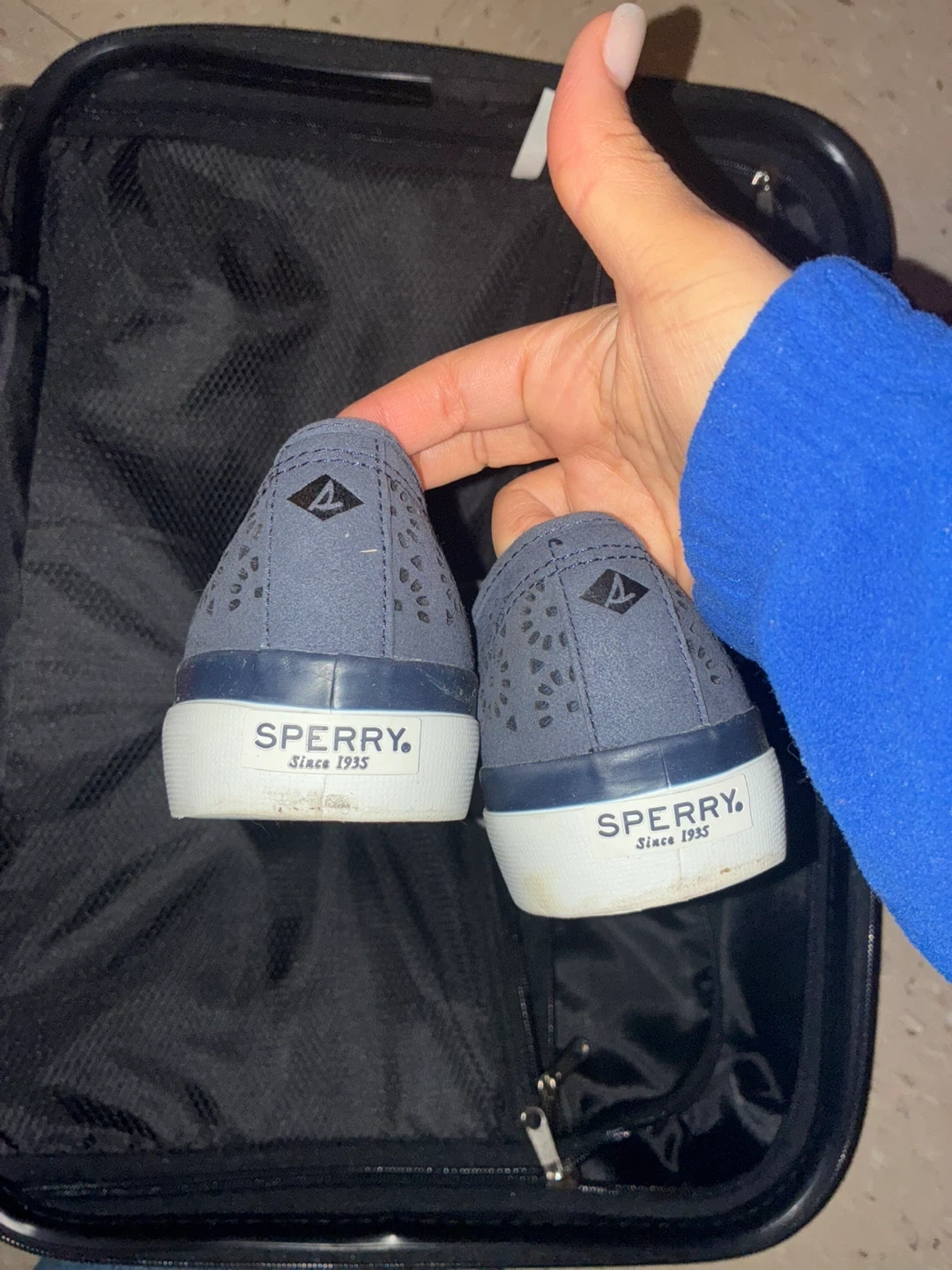 Sperry Top-Sider slip-on sneakers in blue. These shoes feature a breathable perforated design. Comfort insole included. SIZE 7.5