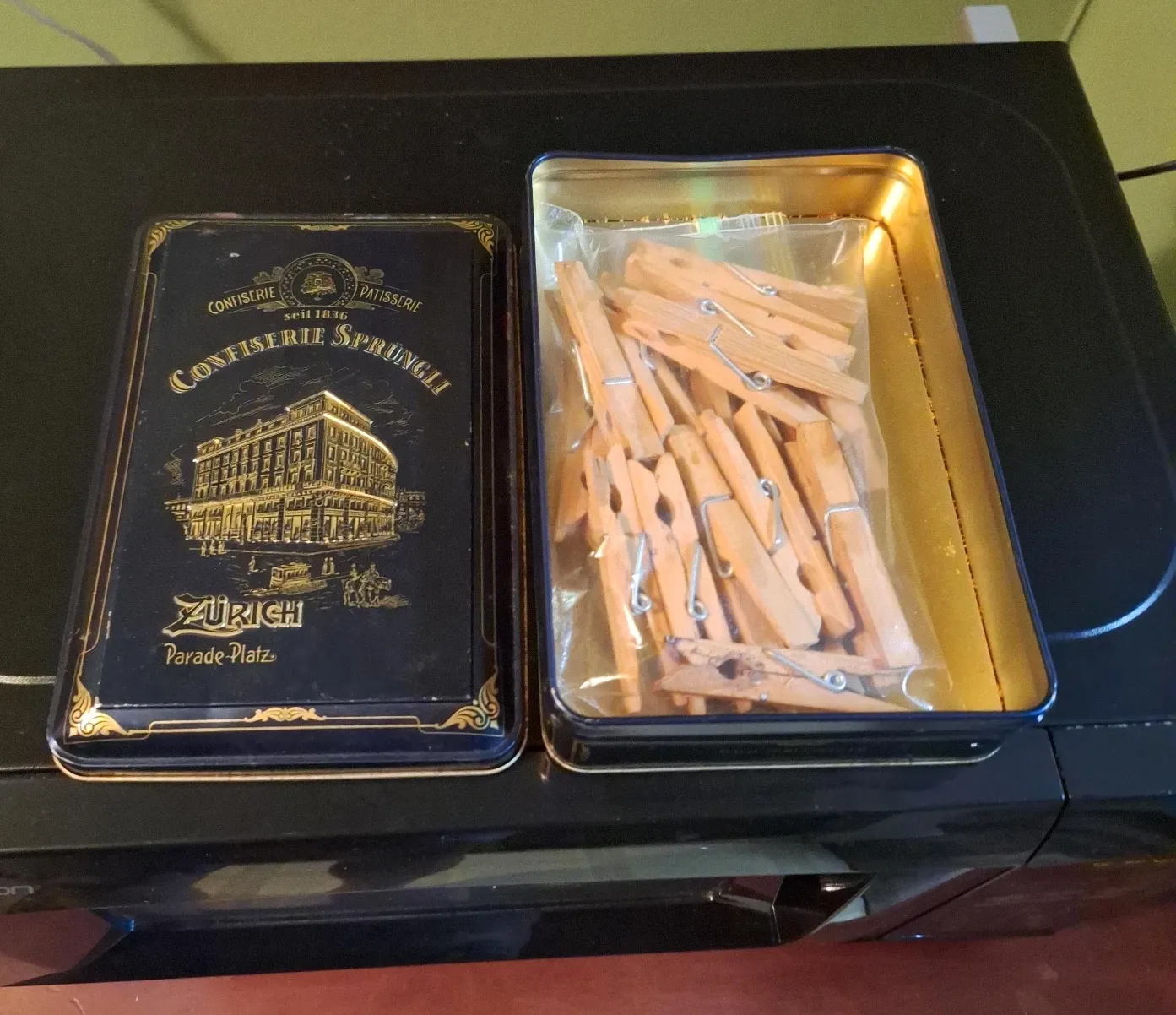 Confiserie Sprüngli Zurich tin filled with wooden clothespins. The tin is decorated with a building and Zurich Parade Platz. The clothespins are inside a plastic bag.
