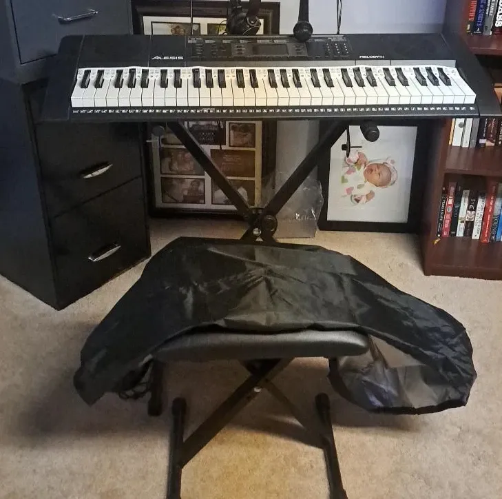 This Alesis Melody 61-key keyboard is perfect for beginners! It includes a microphone for singing along and a pair of headphones for private practice. The keyboard has 300 rhythms and sounds, plus it comes with a power adapter and stand.
