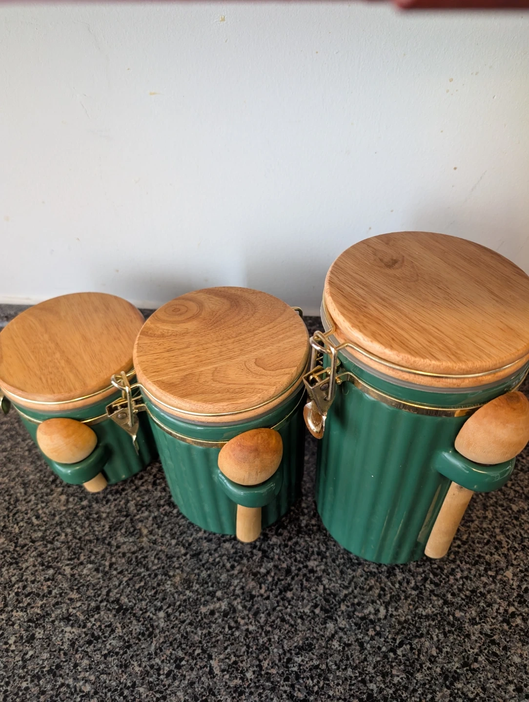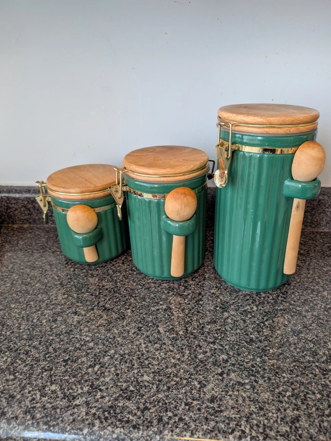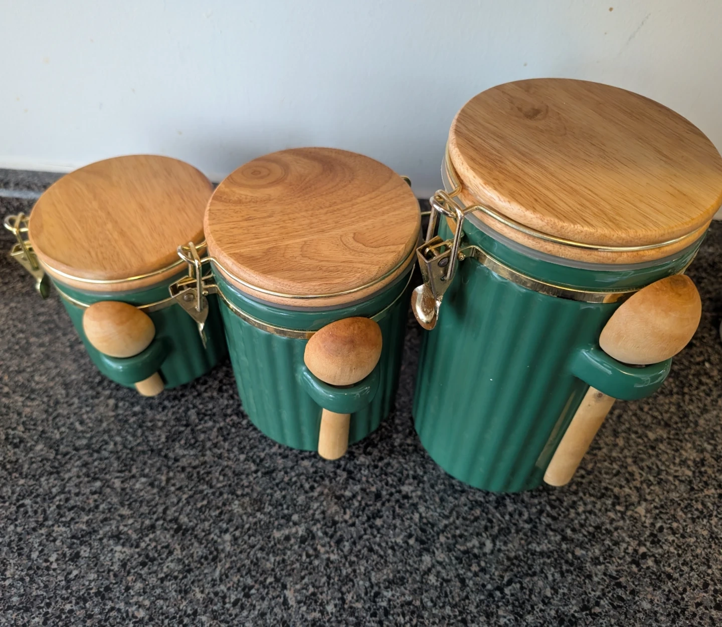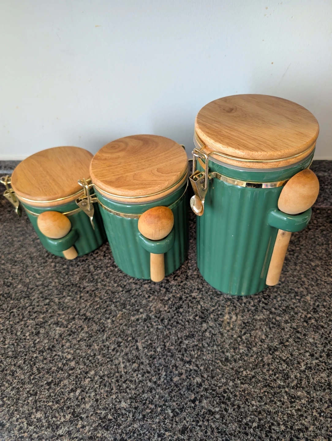 This is a set of three green ceramic canisters with airtight wood lids. They feature a ribbed design and gold-toned clasps. Includes wooden spoons on each canister. Great for storing coffee, tea, or other kitchen staples!