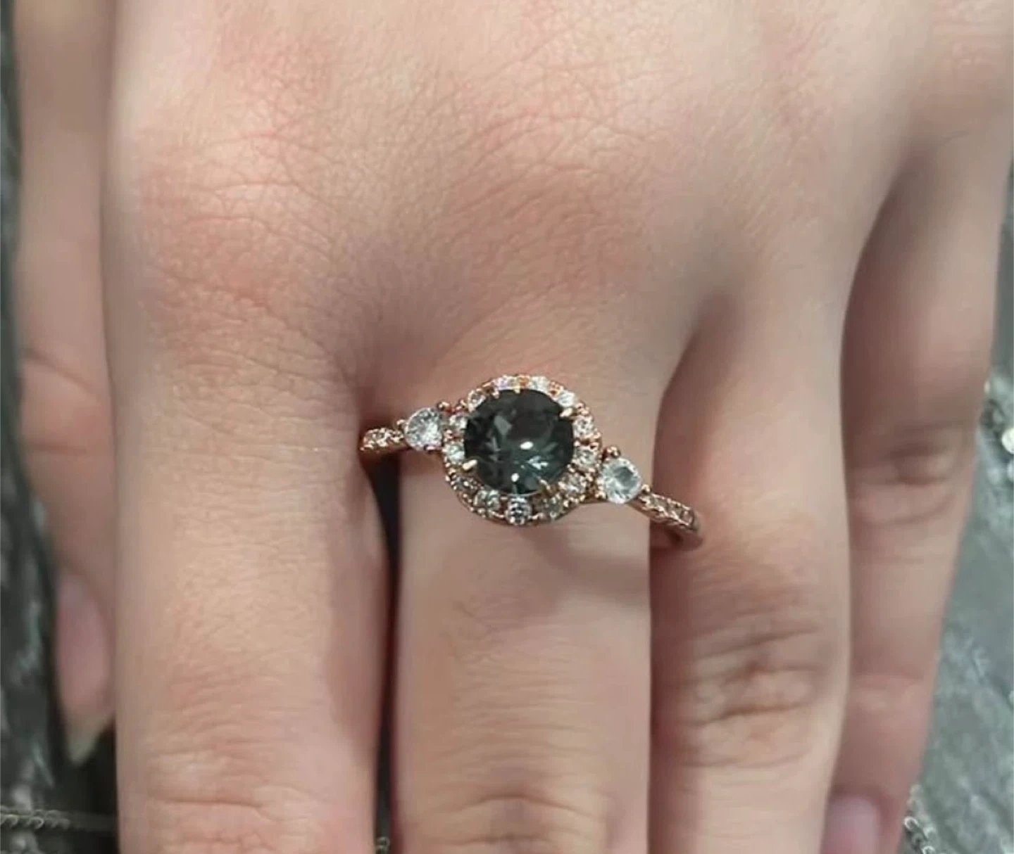 Rose Gold Halo Ring with Dark Center Stone
