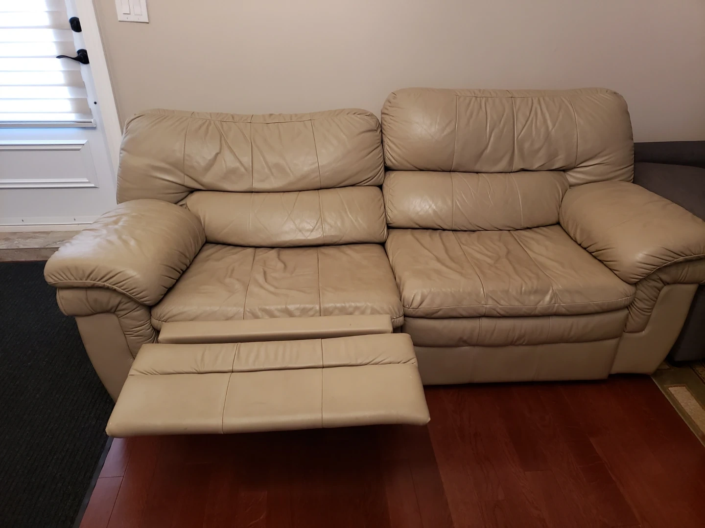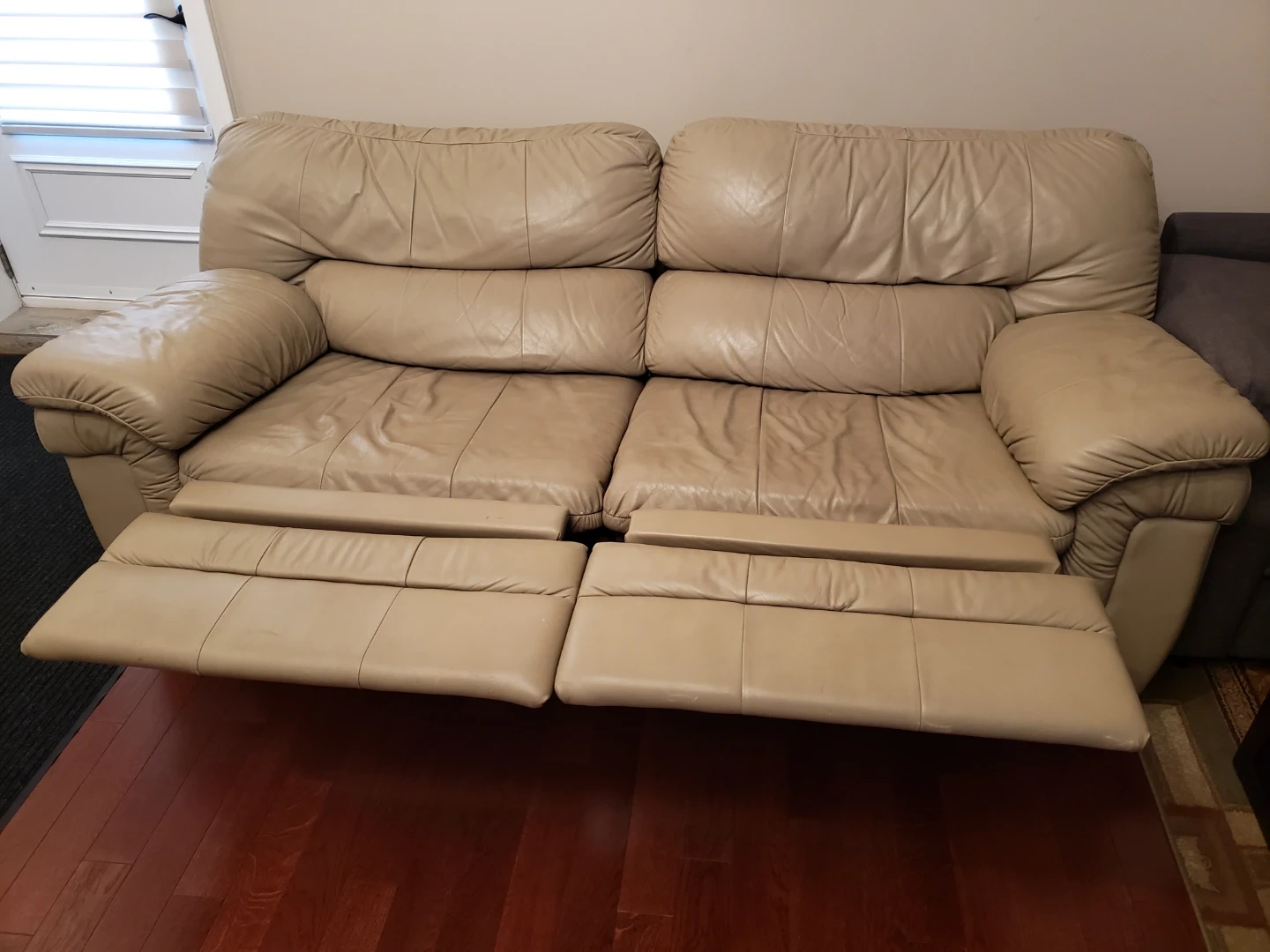Cream coloured leather loveseat with two recliners. This comfortable couch is in good condition and perfect for relaxing. It's a two-seater that offers ample seating space.