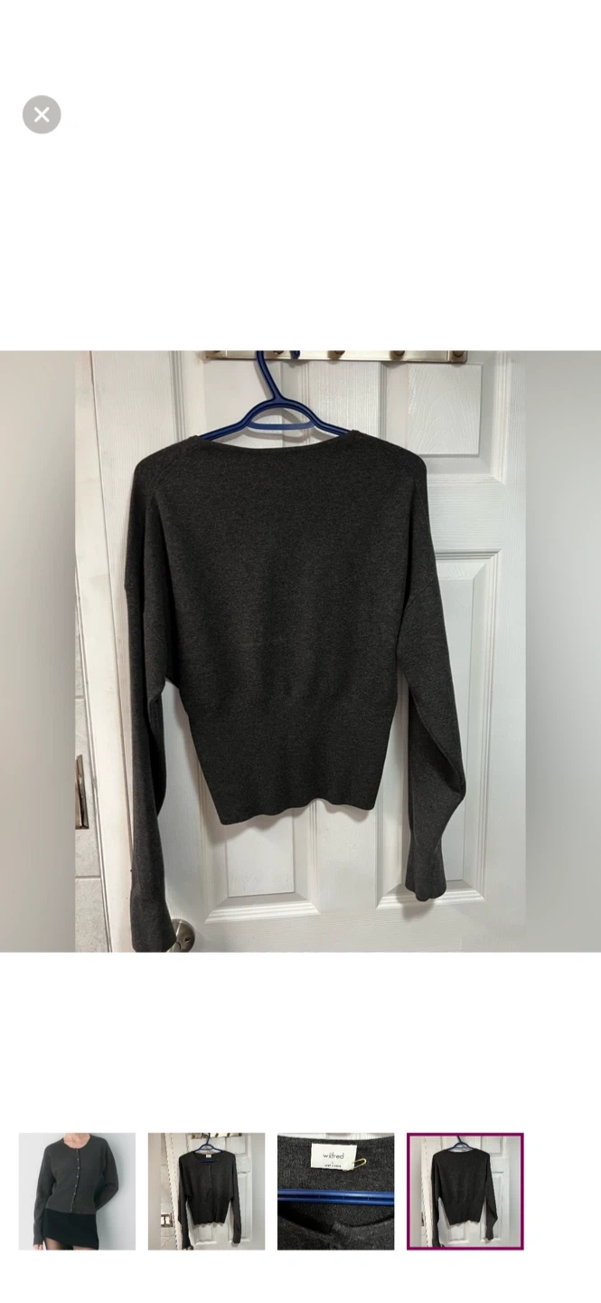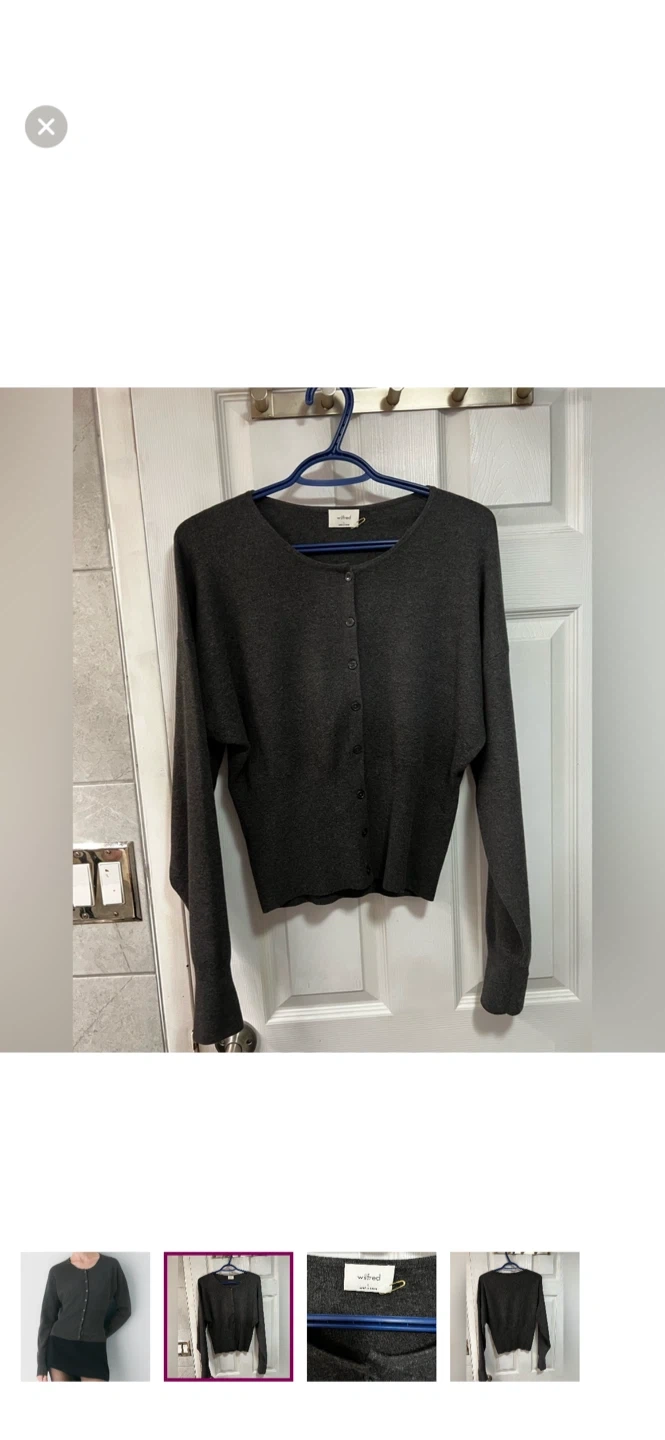 This is a Wilfred Golightly Cardigan in Heather Galaxy, size L. It's a dark grey colour. The material is a soft knit.