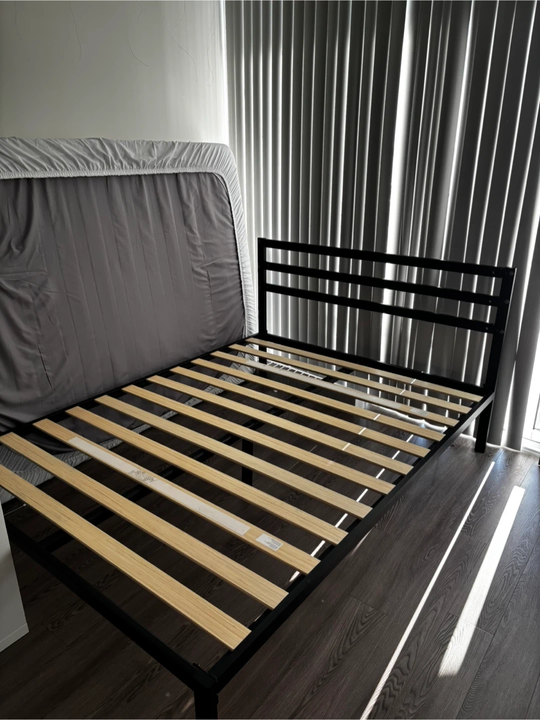 Simple black Zinus metal bed frame with wooden slats. This frame is easy to assemble. It's a queen size bed frame, pick up New West.