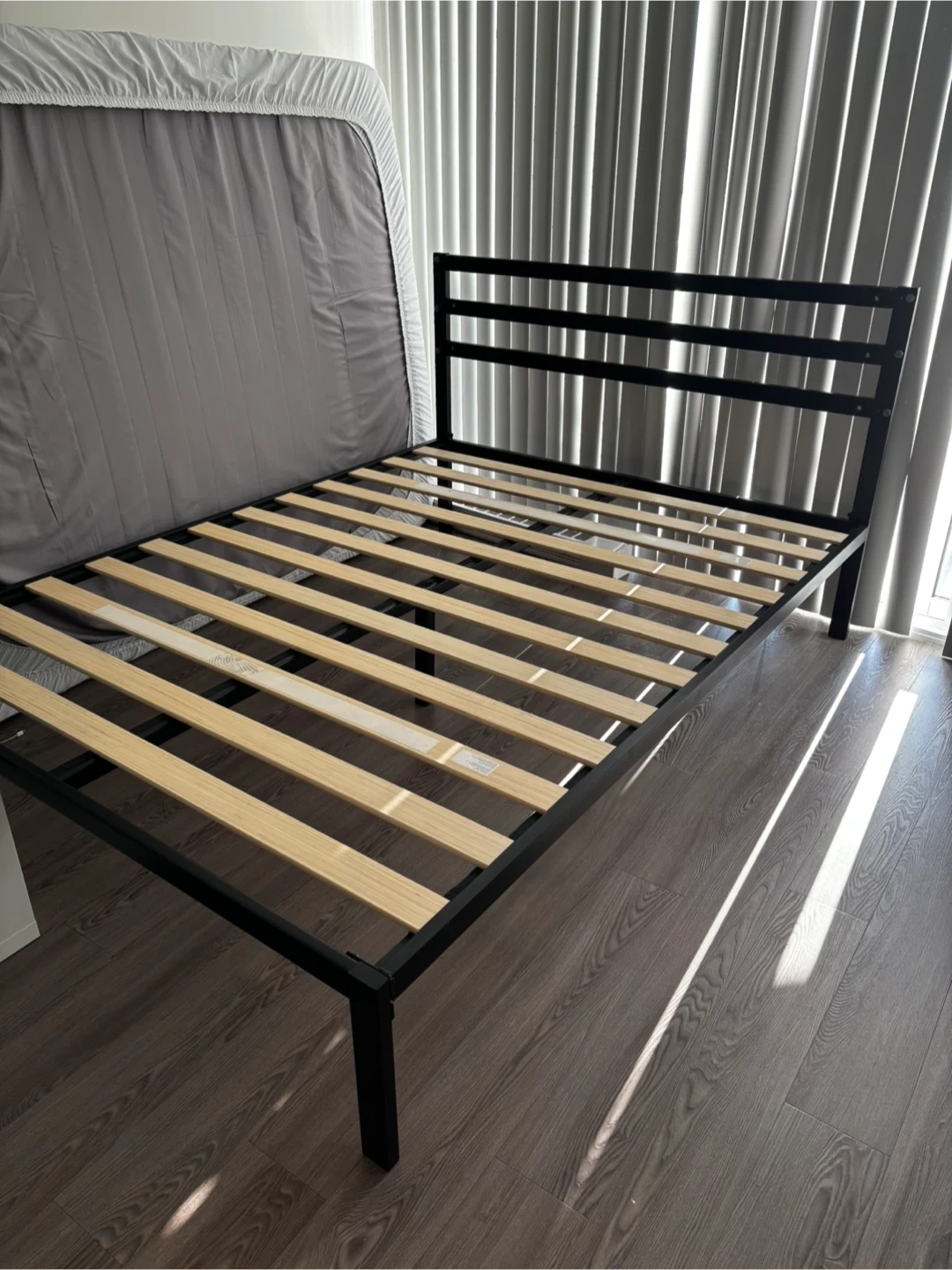 Simple black Zinus metal bed frame with wooden slats. This frame is easy to assemble. It's a queen size bed frame, pick up New West.