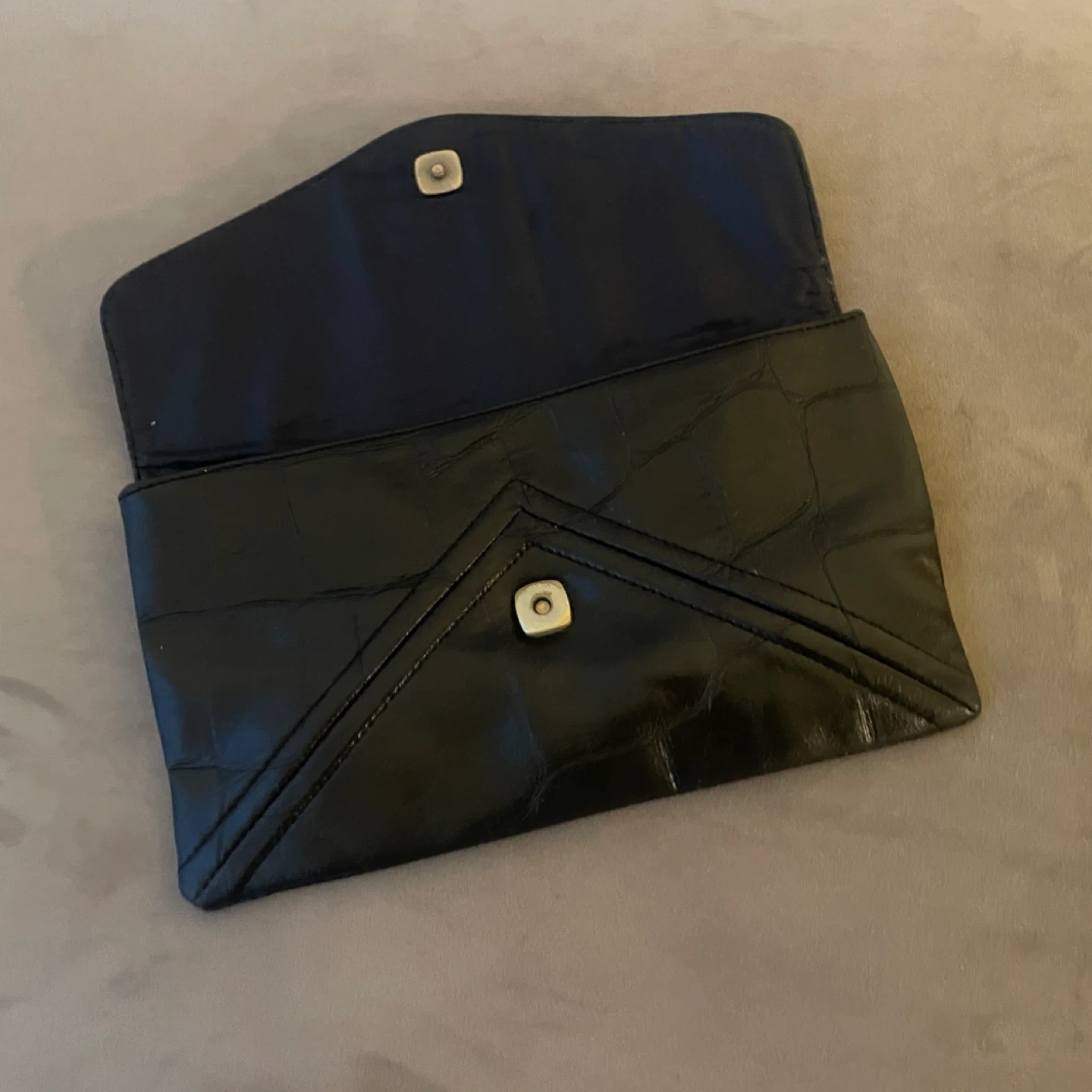 This Tommy Hilfiger clutch wallet is black with a croc embossed finish. It features a secure snap closure and multiple interior pockets for organization.