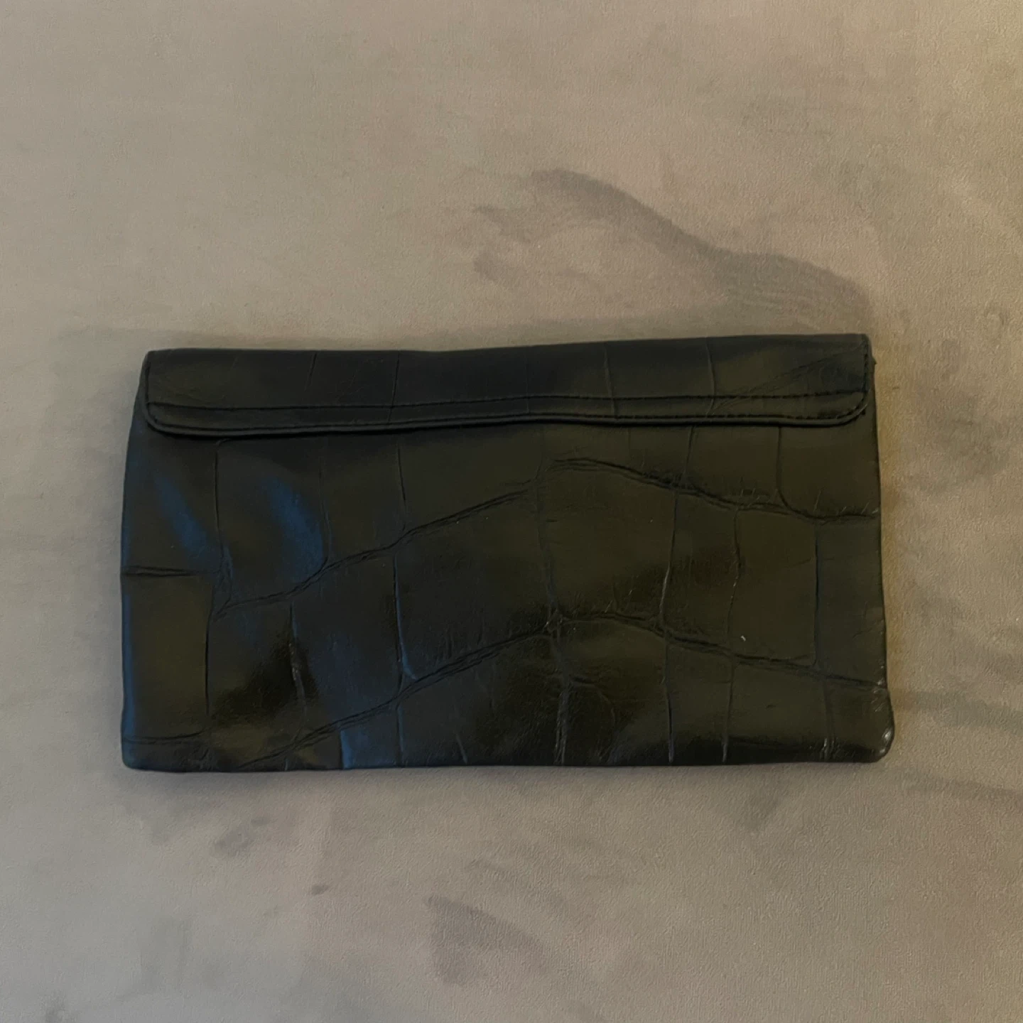 This Tommy Hilfiger clutch wallet is black with a croc embossed finish. It features a secure snap closure and multiple interior pockets for organization.