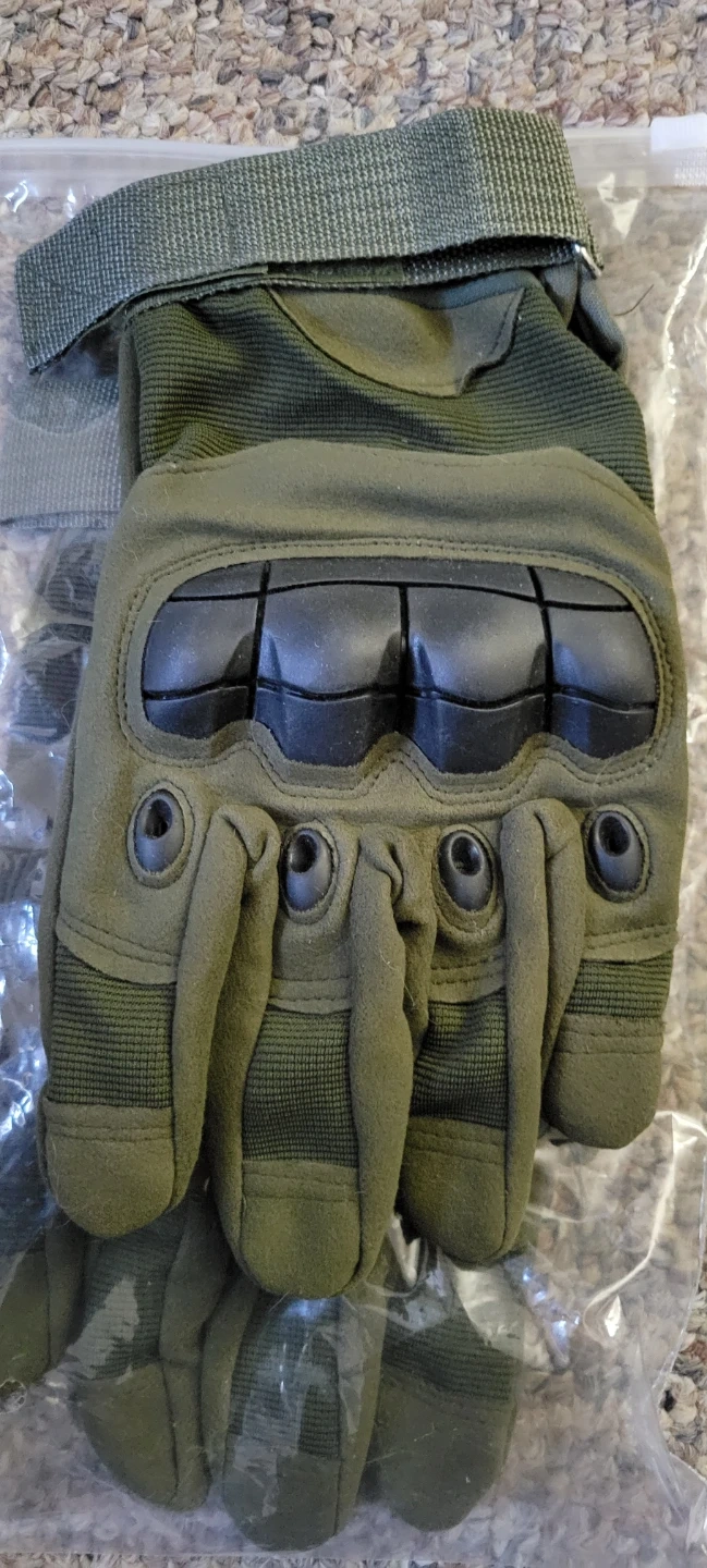 These are XL green tactical gloves. They have knuckle protection and a textured palm for grip. Made for outdoor use. New never used needed bigger size.Great for airsoft or paintball.