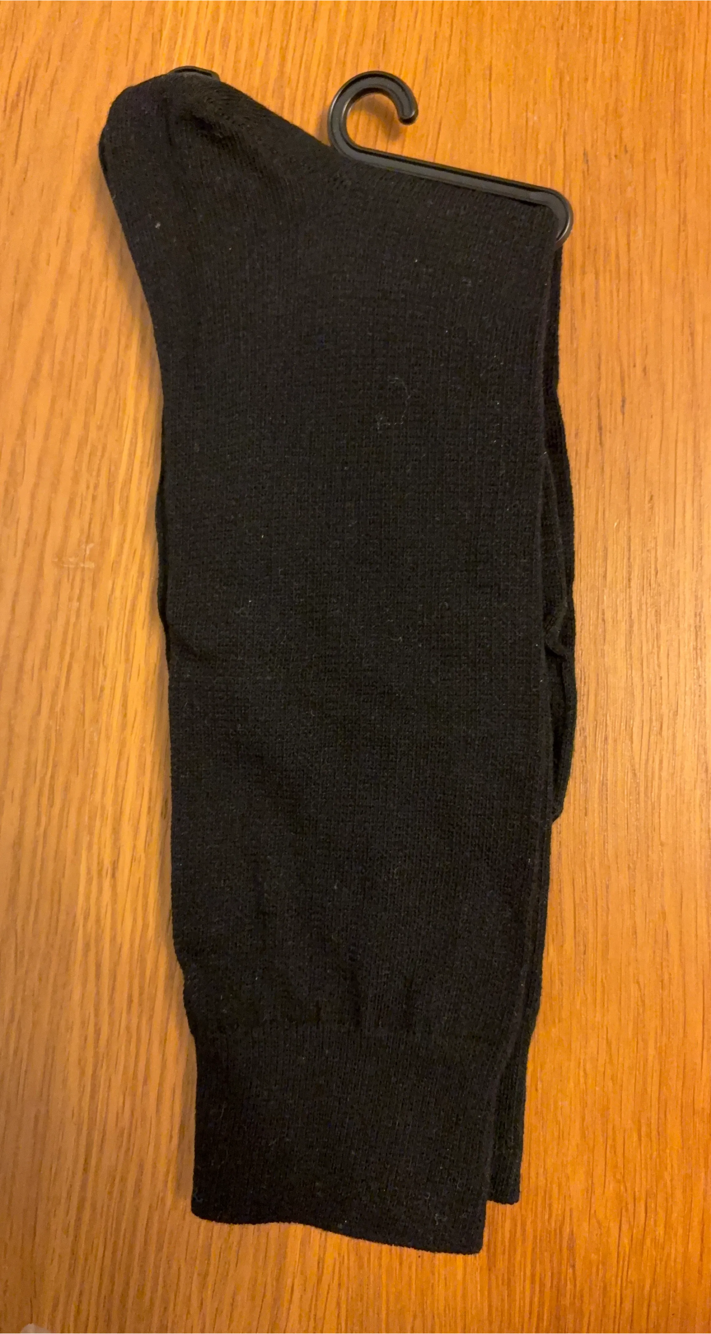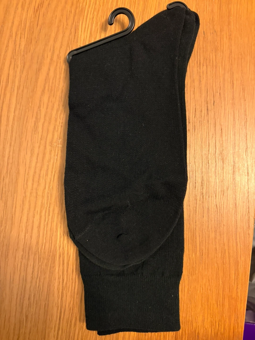 These are black crew socks, perfect for everyday wear. They're made from a comfortable knit material. These socks are useful for keeping your feet warm and protected.