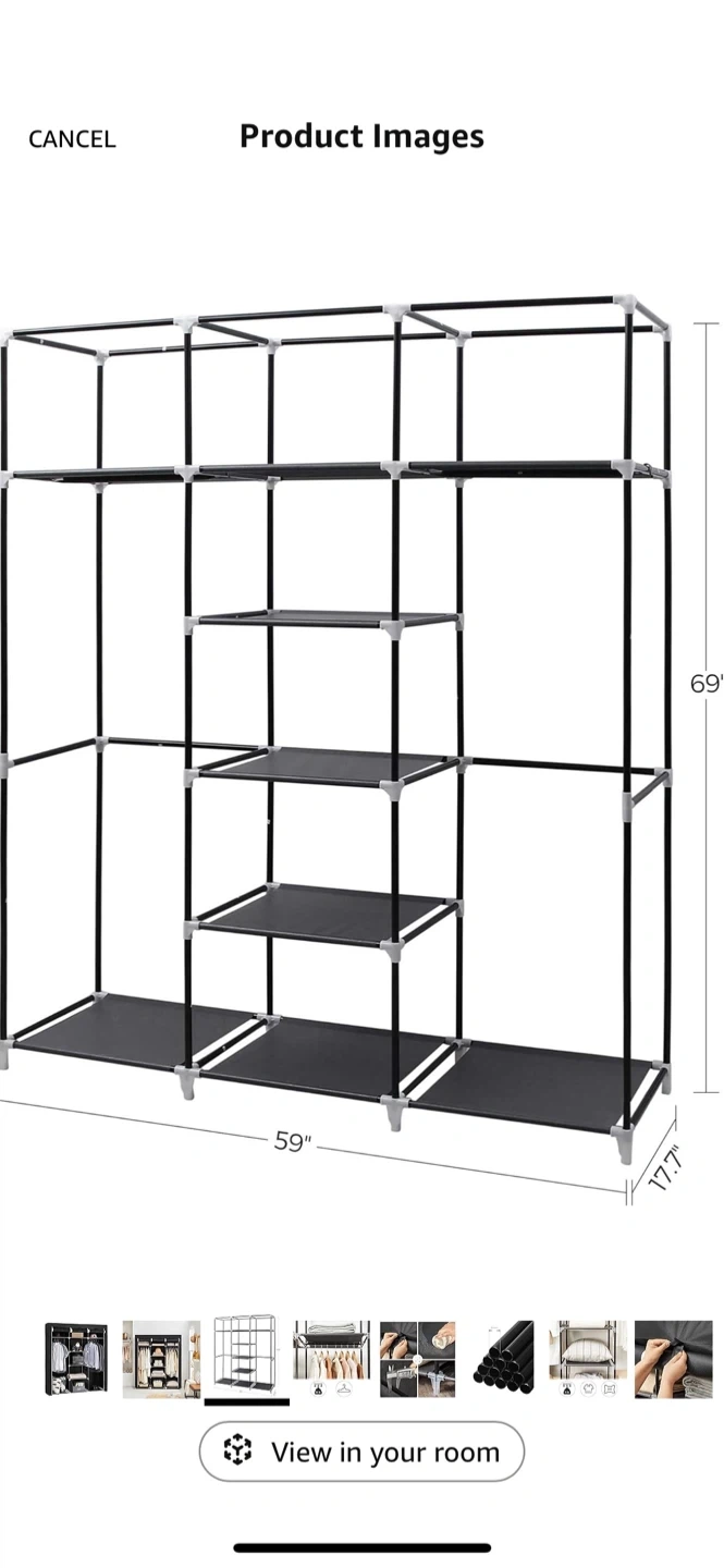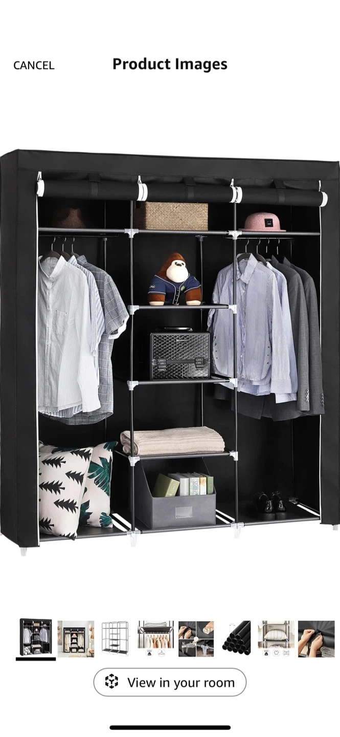 SONGMICS portable wardrobe in Ink Black. It's a non-woven fabric closet with multiple shelves and hanging rods. Dimensions are 59" W x 17.7" D x 69" H. It's great for organizing clothes and accessories!