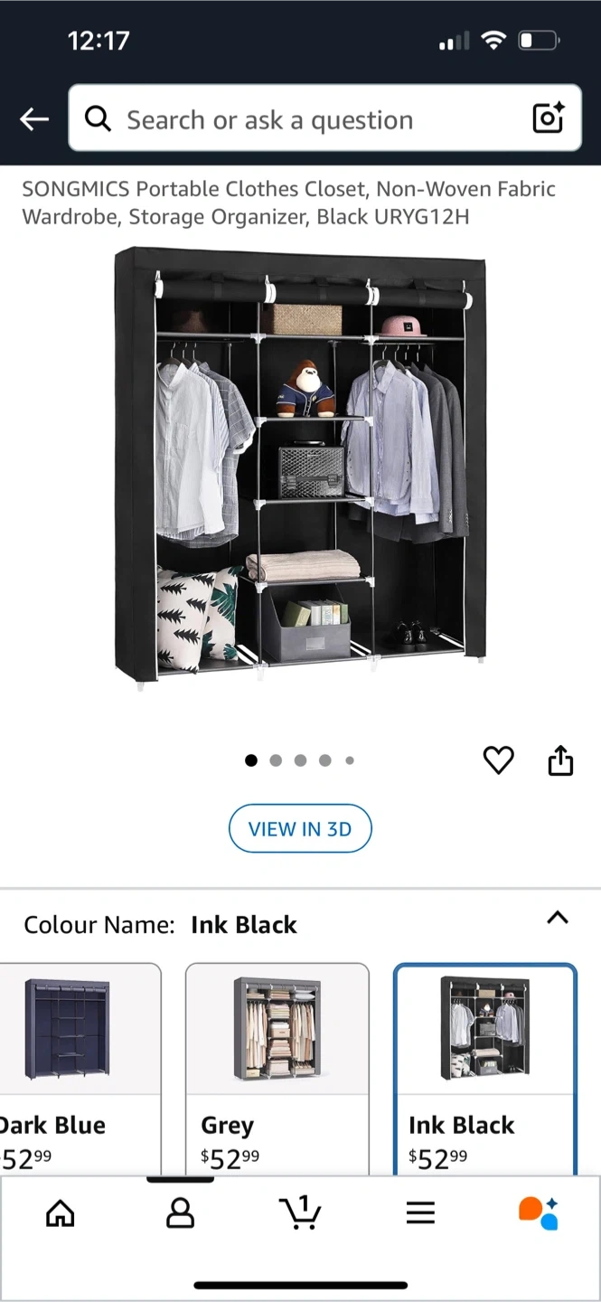 SONGMICS portable wardrobe in Ink Black. It's a non-woven fabric closet with multiple shelves and hanging rods. Dimensions are 59" W x 17.7" D x 69" H. It's great for organizing clothes and accessories!