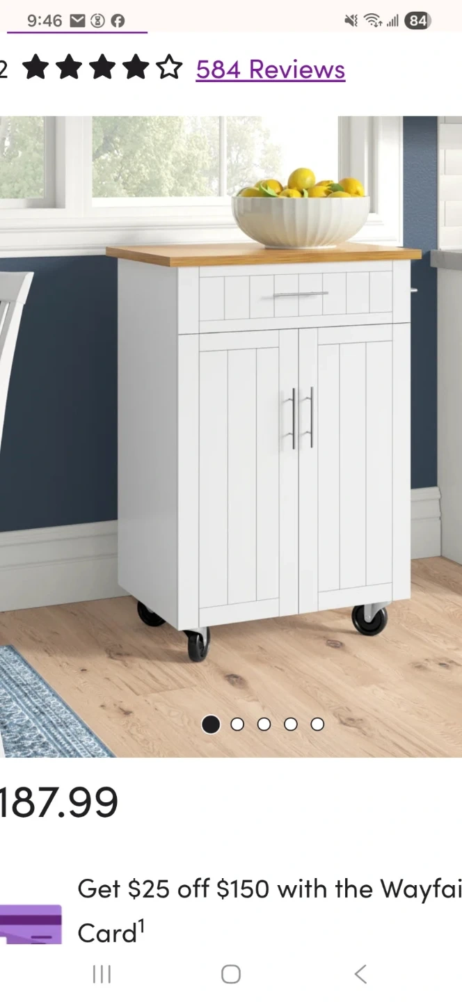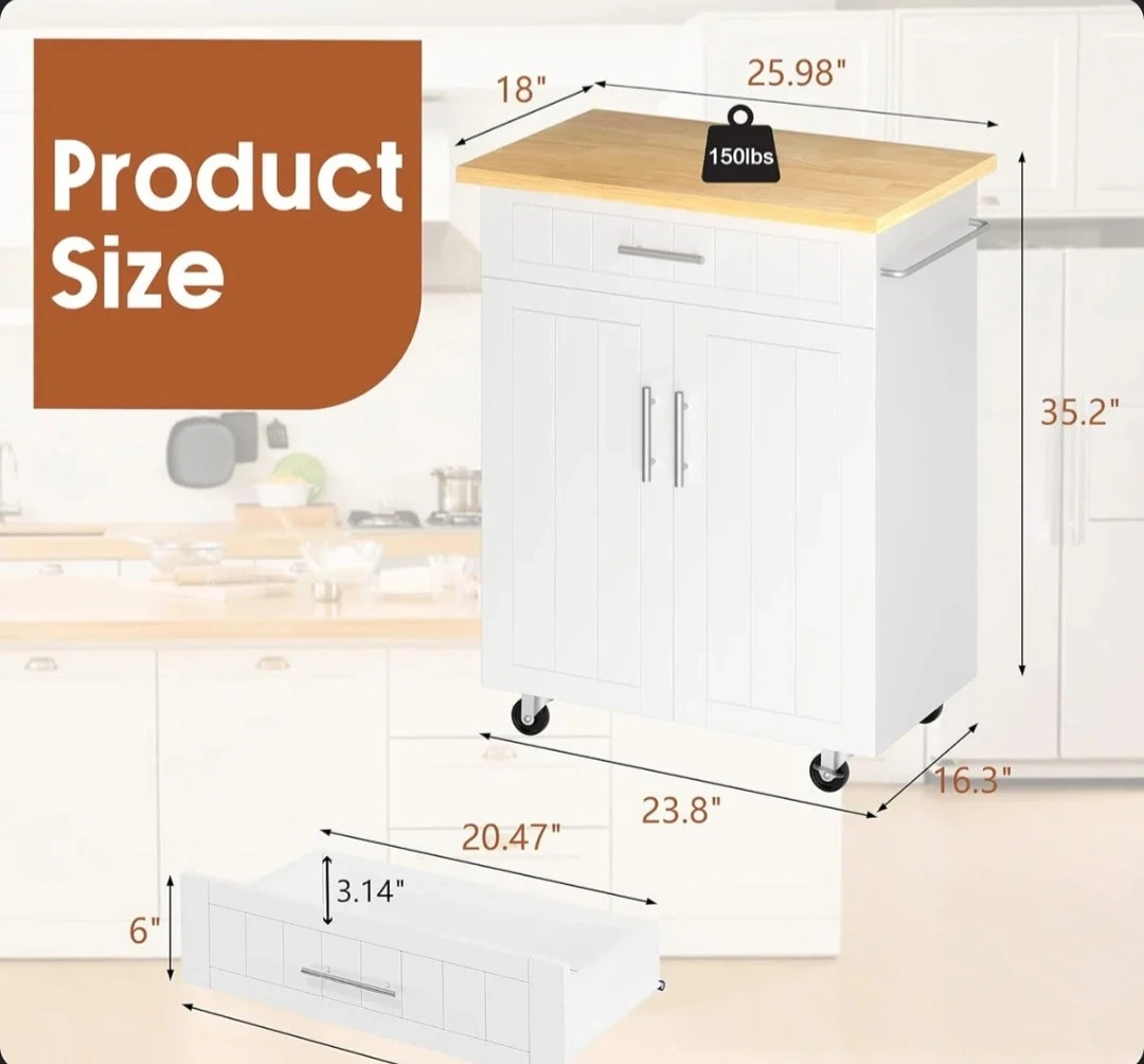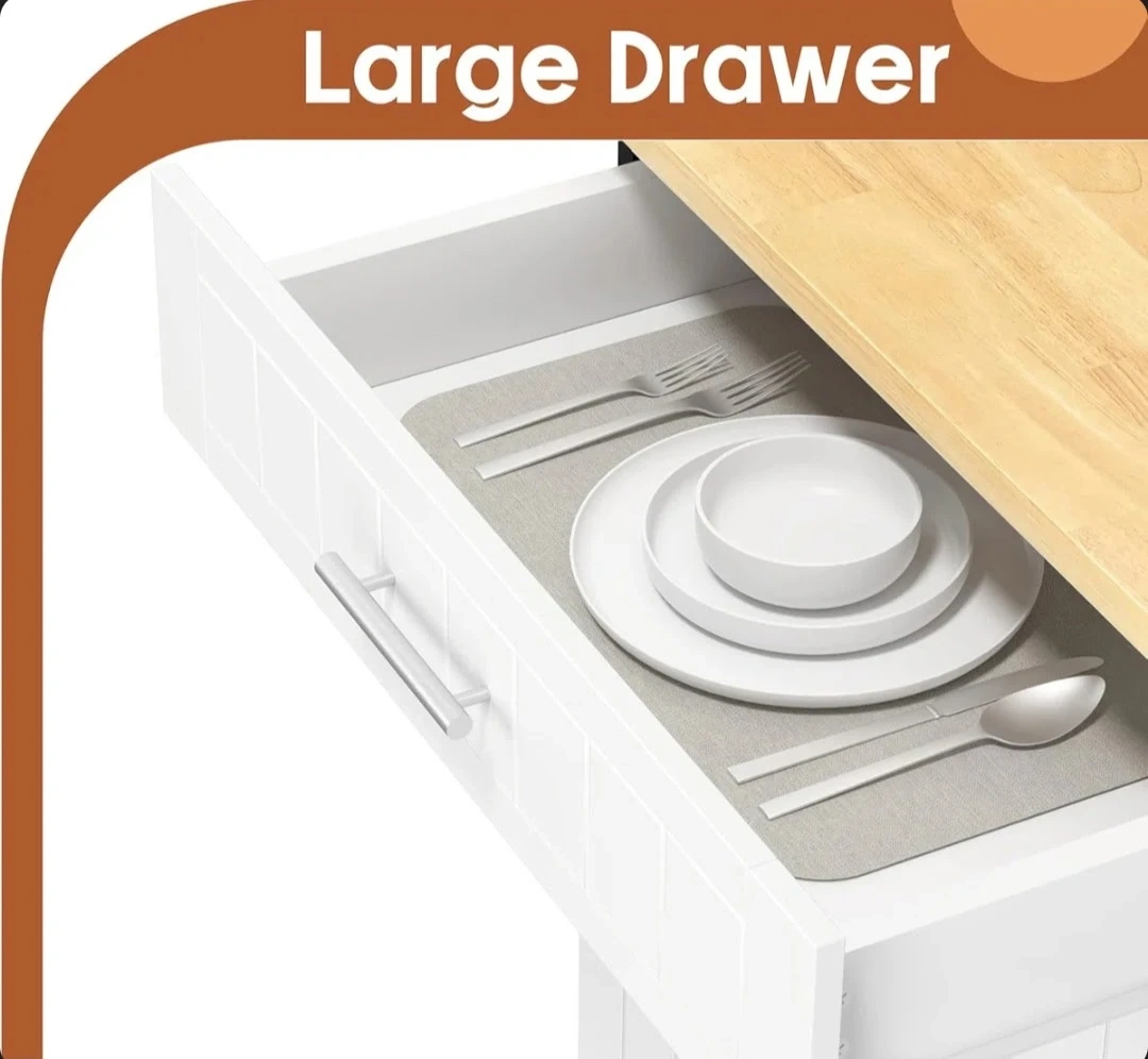 This kitchen cart features a butcher block wood top and a spacious drawer. It has two doors that open to shelving and two lockable swivel wheels for easy mobility. Perfect for adding extra prep space or storage in your kitchen! Brand new. Unopened Box.