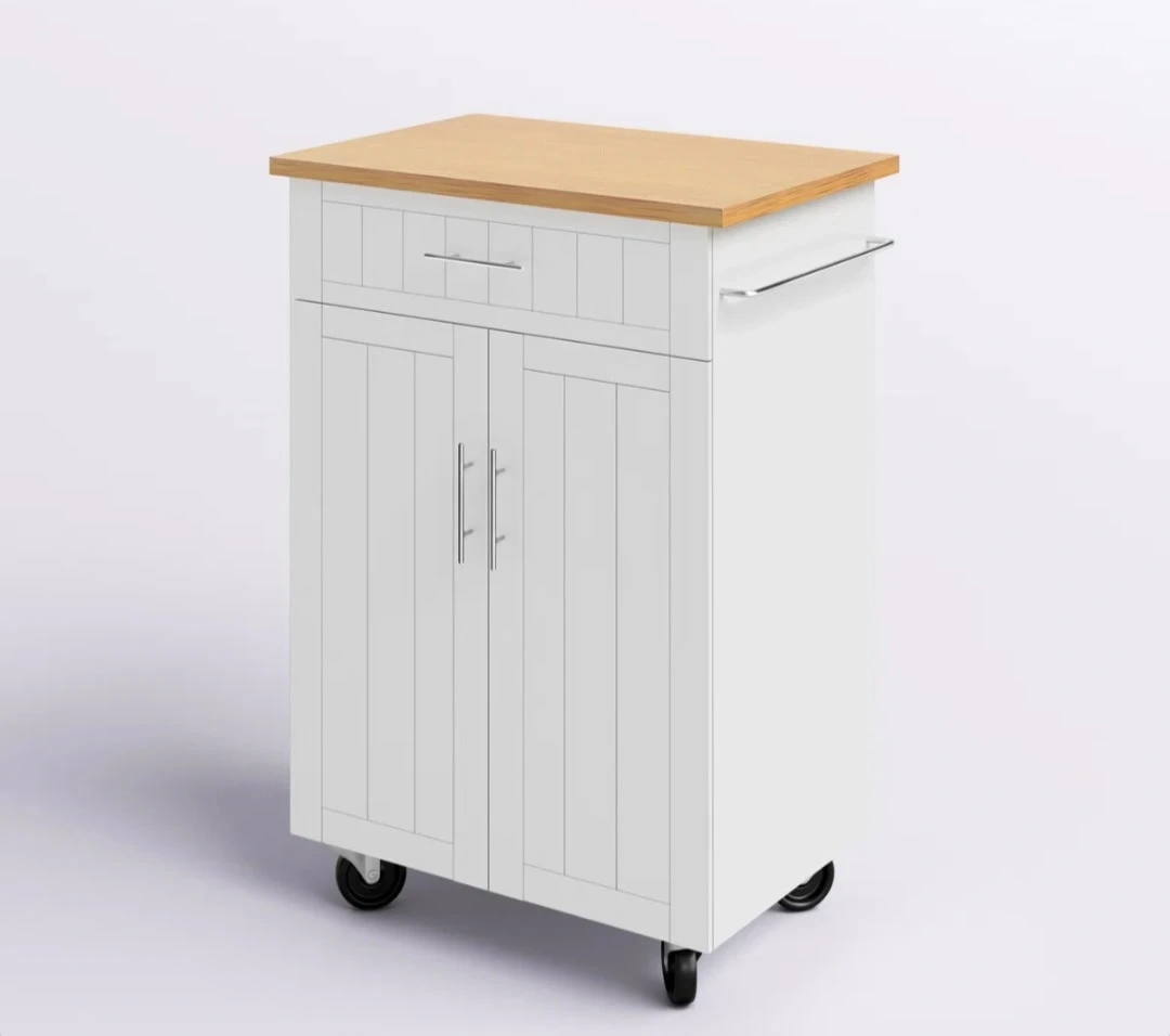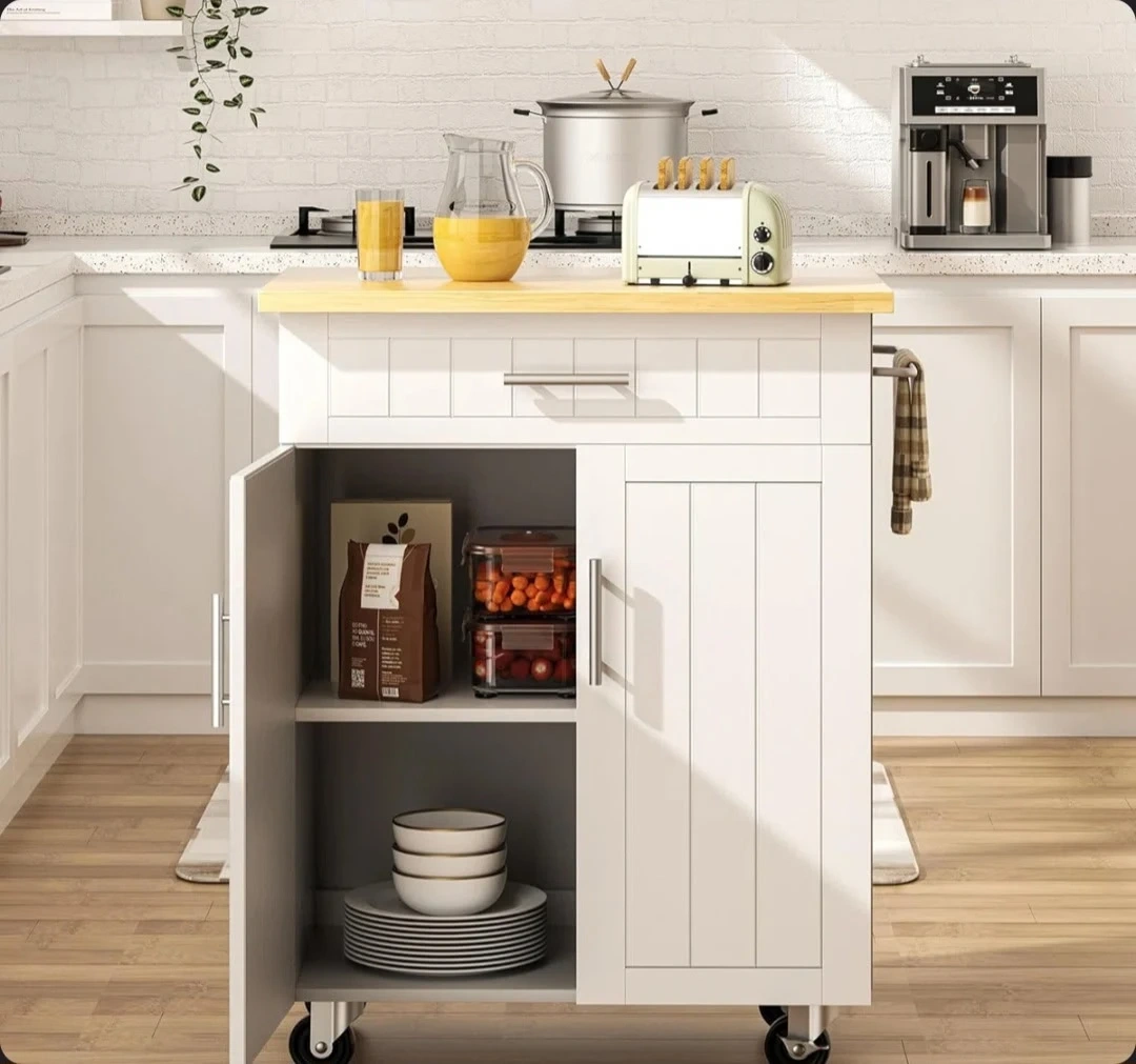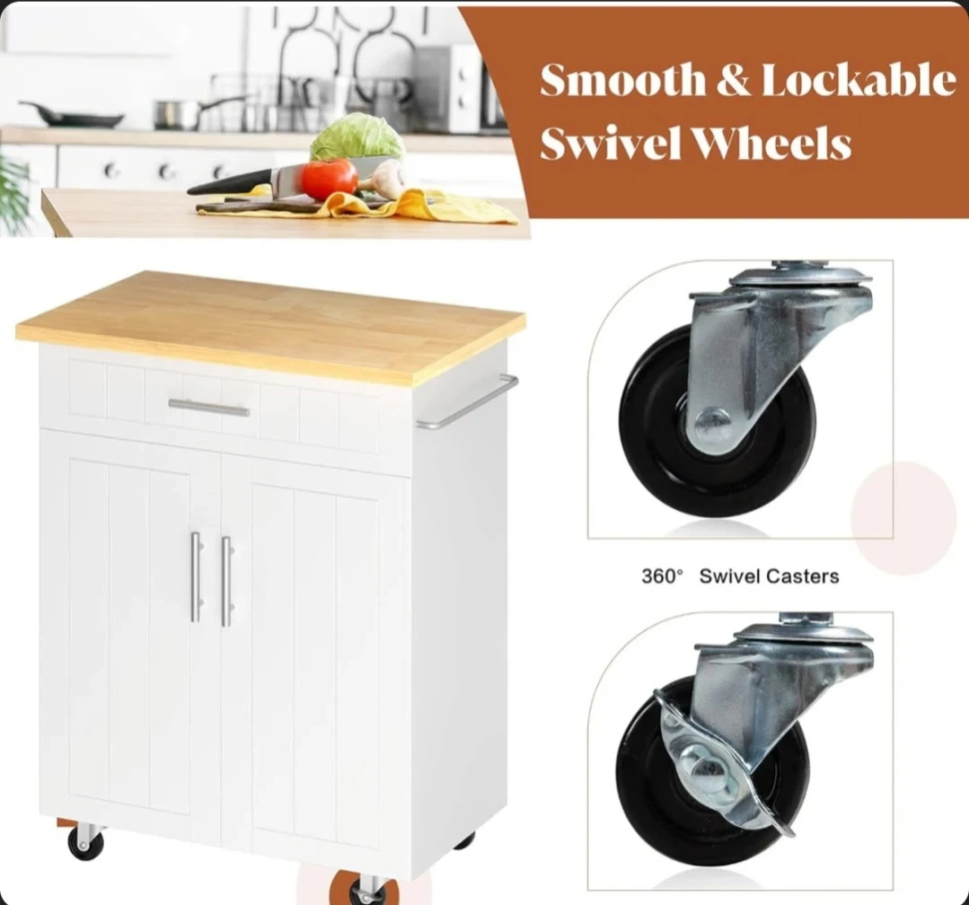 This kitchen cart features a butcher block wood top and a spacious drawer. It has two doors that open to shelving and two lockable swivel wheels for easy mobility. Perfect for adding extra prep space or storage in your kitchen! Brand new. Unopened Box.
