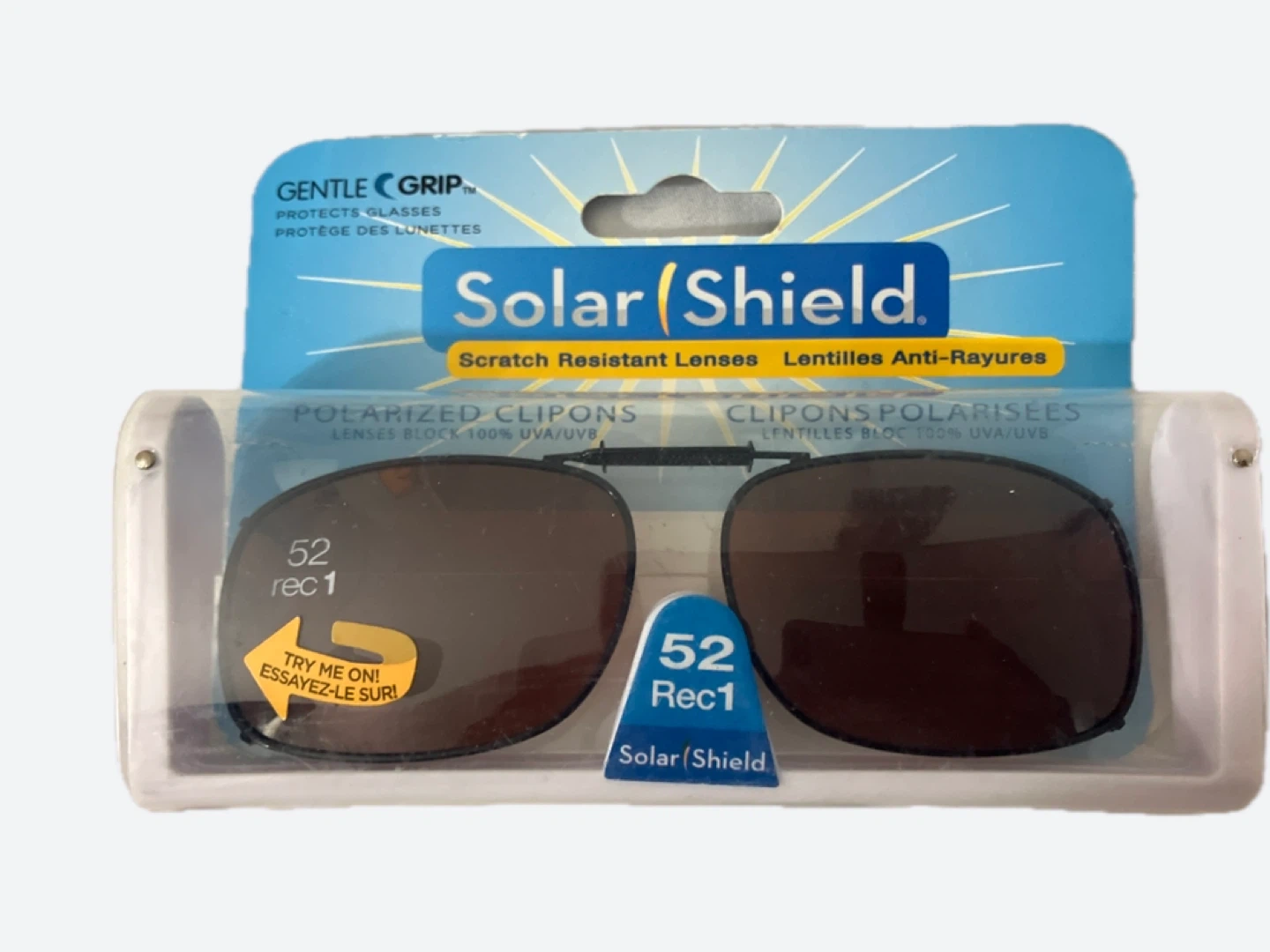 These Solar Shield clip-on sunglasses offer polarized lenses that block 100% UVA/UVB. They're scratch resistant and come in a grey lens colour. These are designed to fit over eyeglasses and meet ANSI Z80.3-2010 standards.