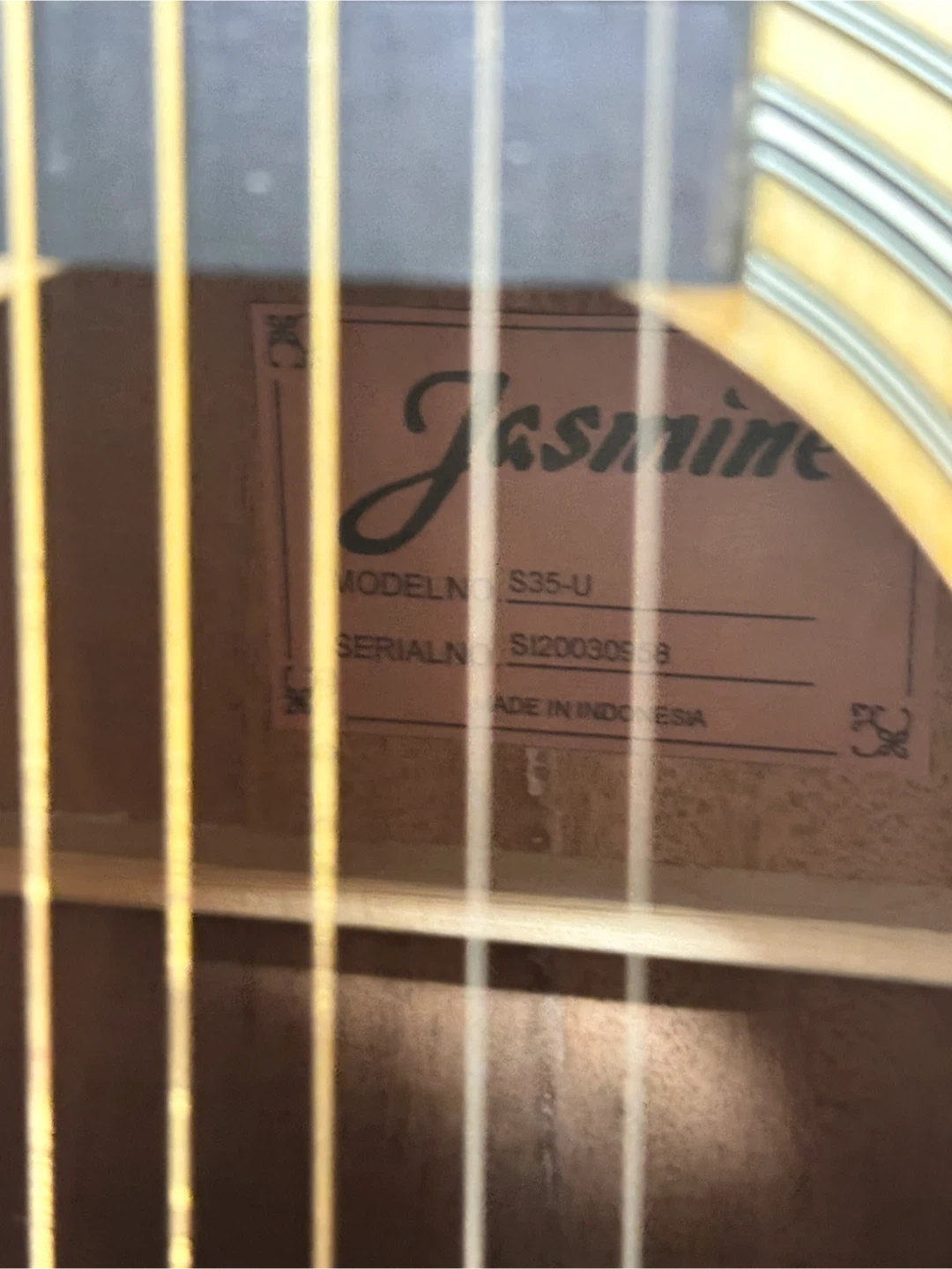 This is a Jasmine acoustic guitar. It comes with a black gig bag for easy transport and protection.