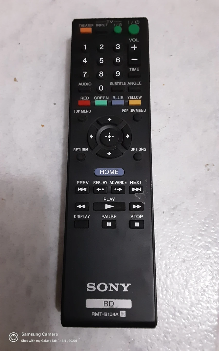 This is a Sony RMT-B104A Blu-ray disc remote control. It features a full keypad, navigation buttons, and playback controls. Perfect for operating your Sony Blu-ray player!