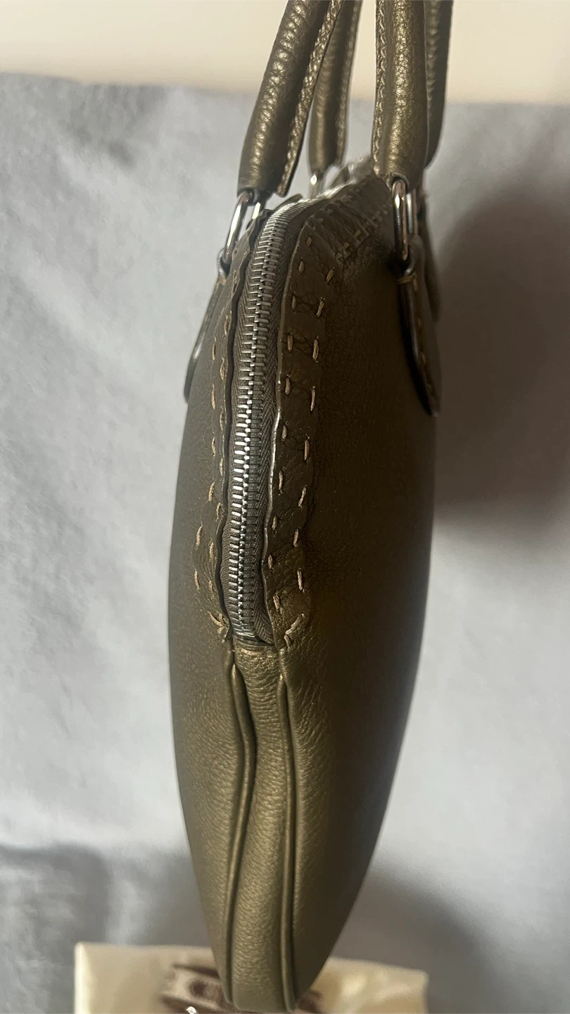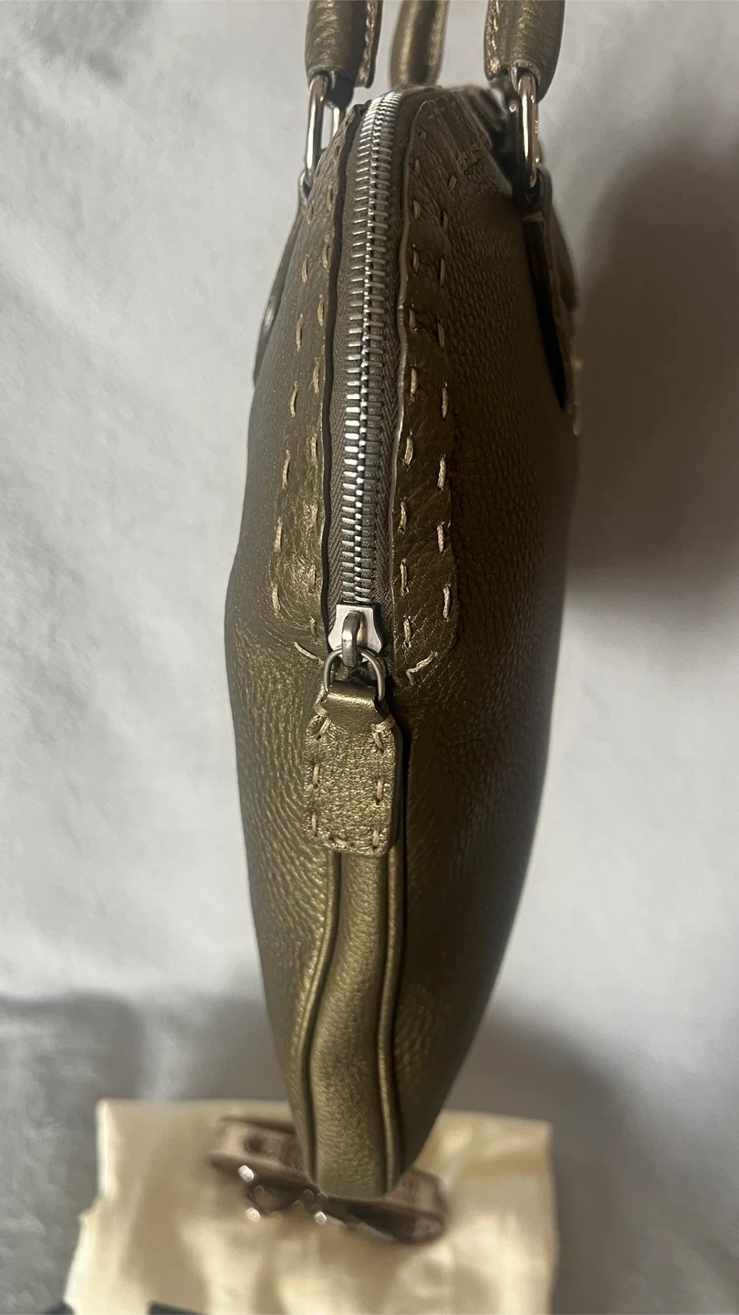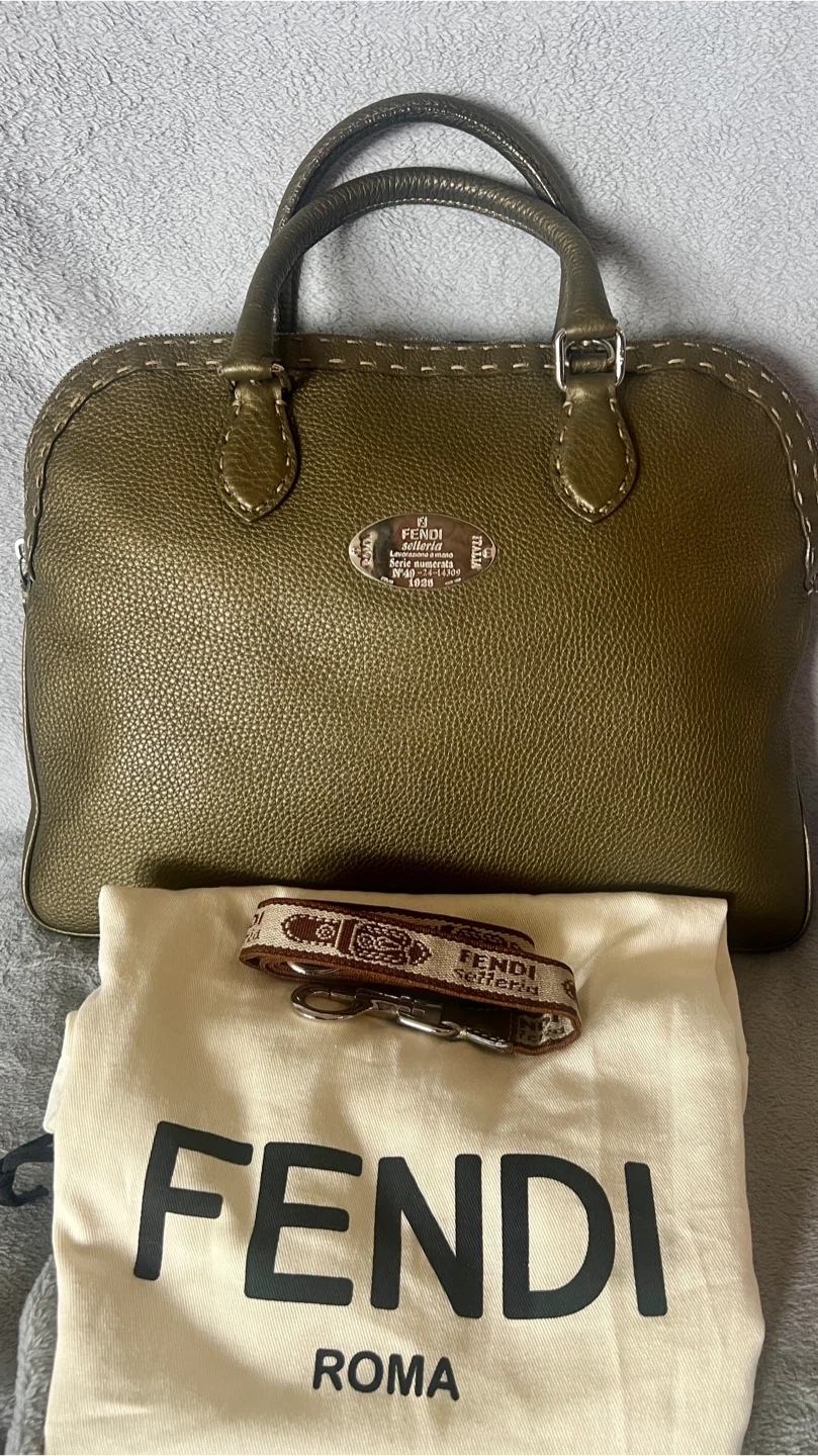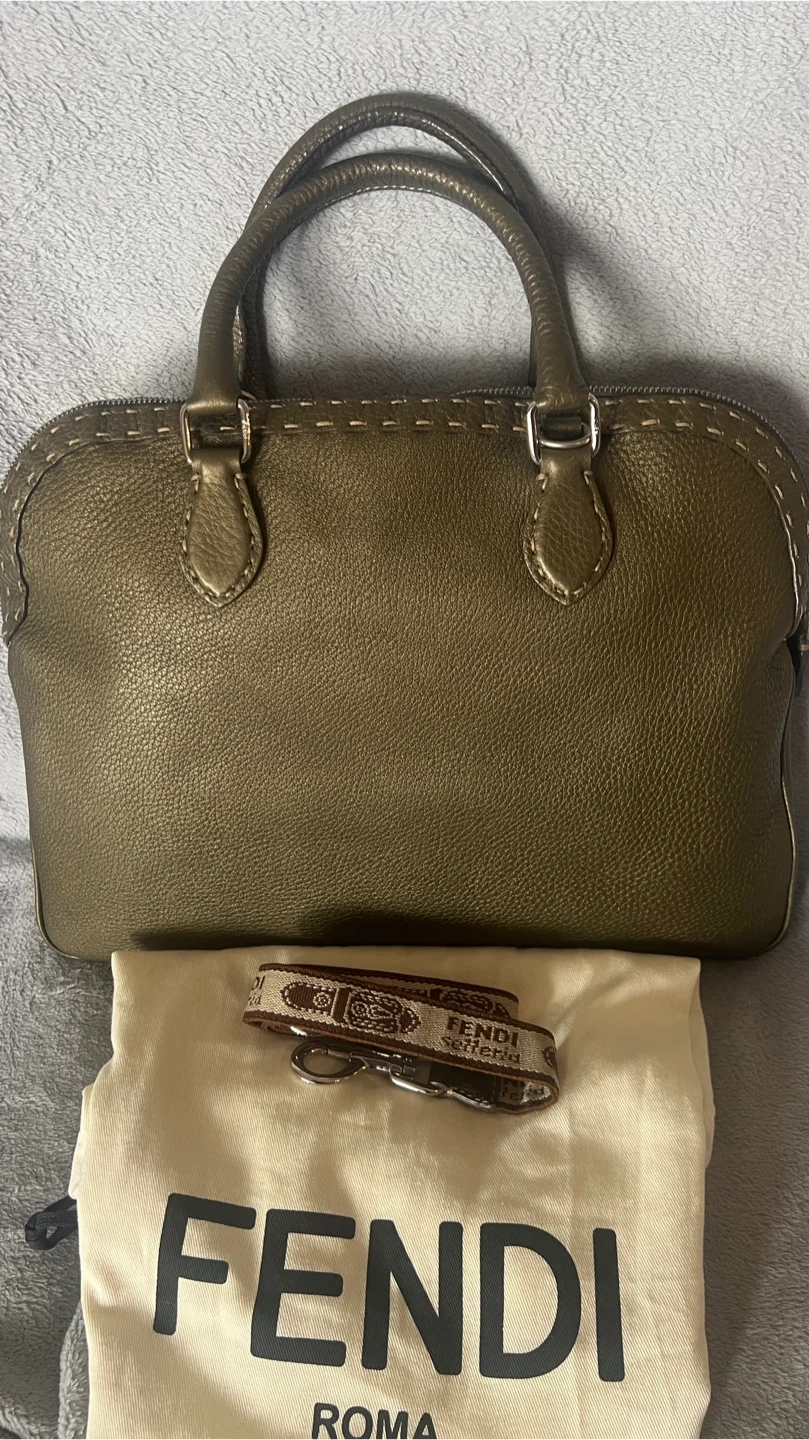 This is a Fendi Selleria bag. It's made of leather. Includes dust bag and a detachable strap. In very good condition, no scratches.