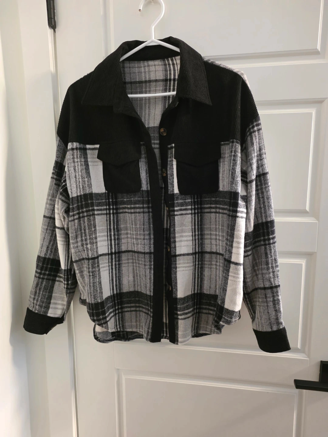 Black and White Plaid Shirt Jacket with Corduroy Accents