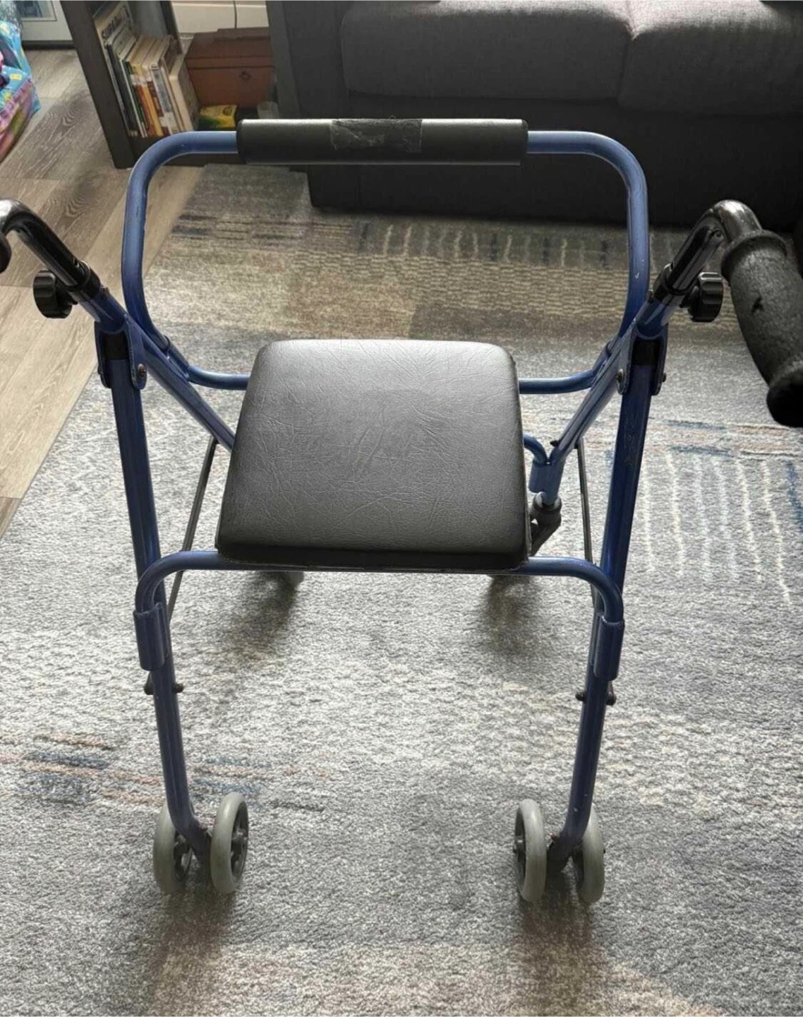 This walker features a black frame and a black seat. It's designed for stability and offers a place to rest. It includes wheels for easy movement.