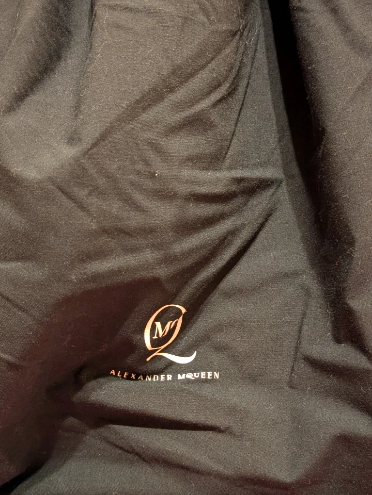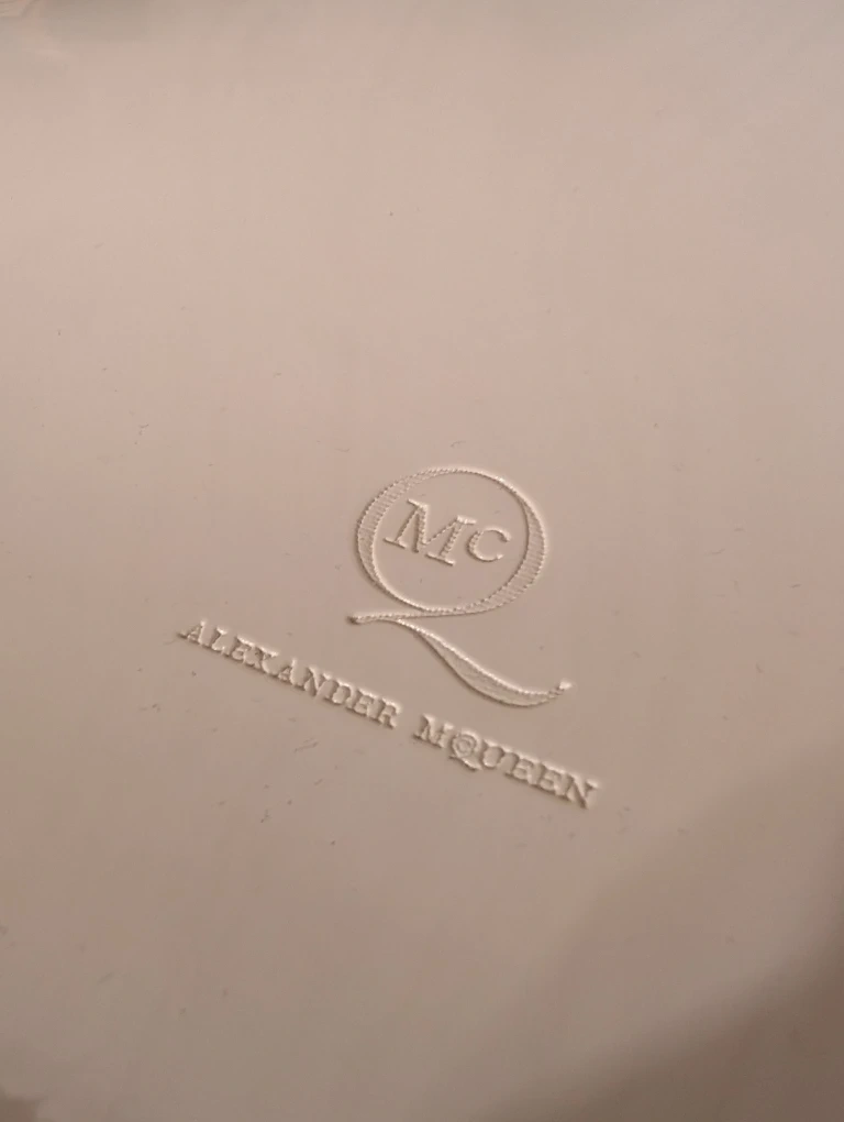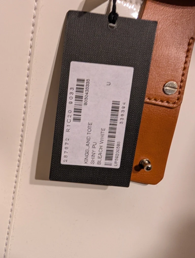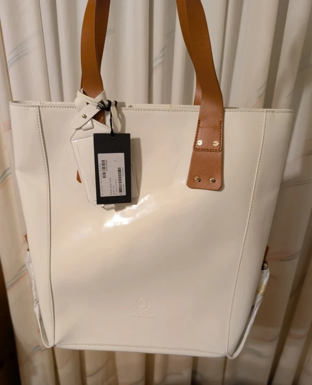 This is a brand new Alexander McQueen Kingsland tote bag in a bleach white PU finish with tags on. It features contrasting tan leather handles and a debossed McQueen logo. This spacious tote is perfect for everyday use or as a stylish travel companion. Minor blemish in material shown in photo 5. Comes with bag cover.