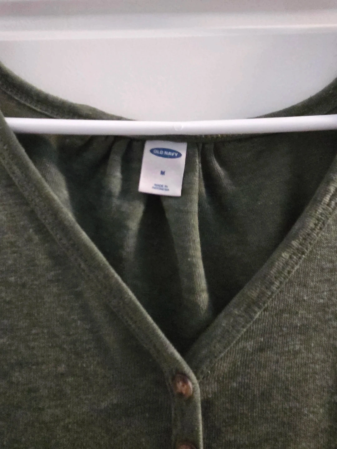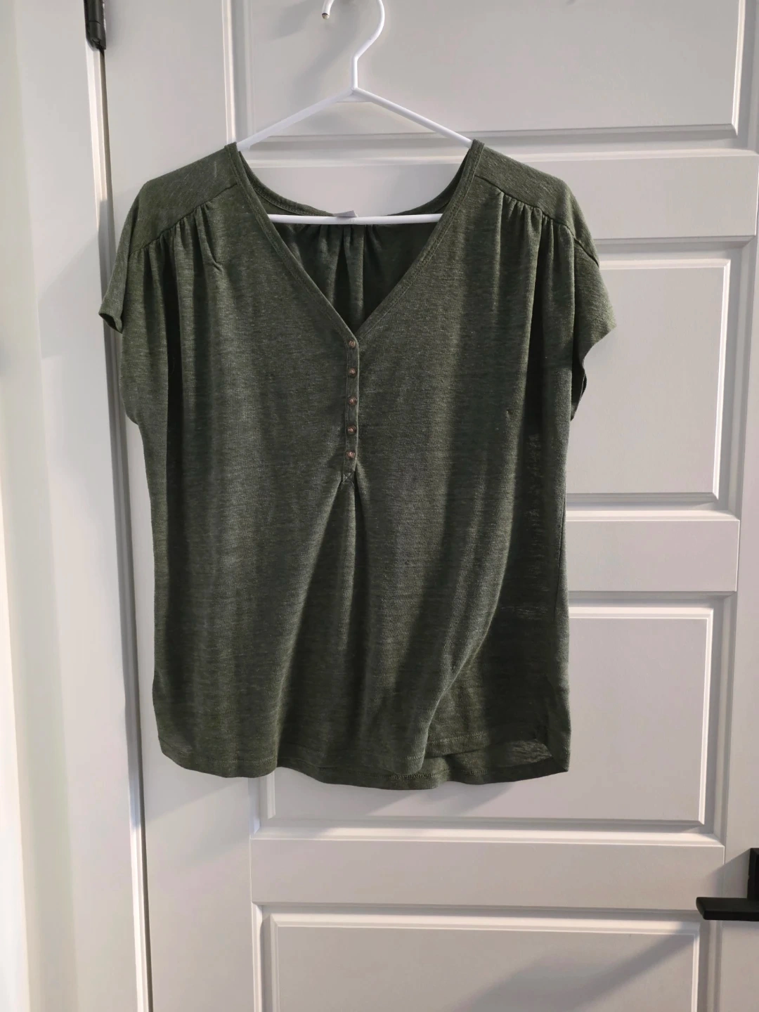 Old Navy green v-neck t-shirt with button-up detail. It's a size medium. This top's made from a soft, breathable fabric.