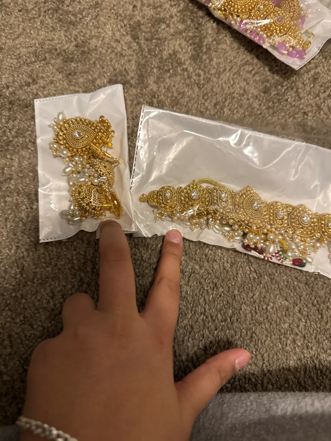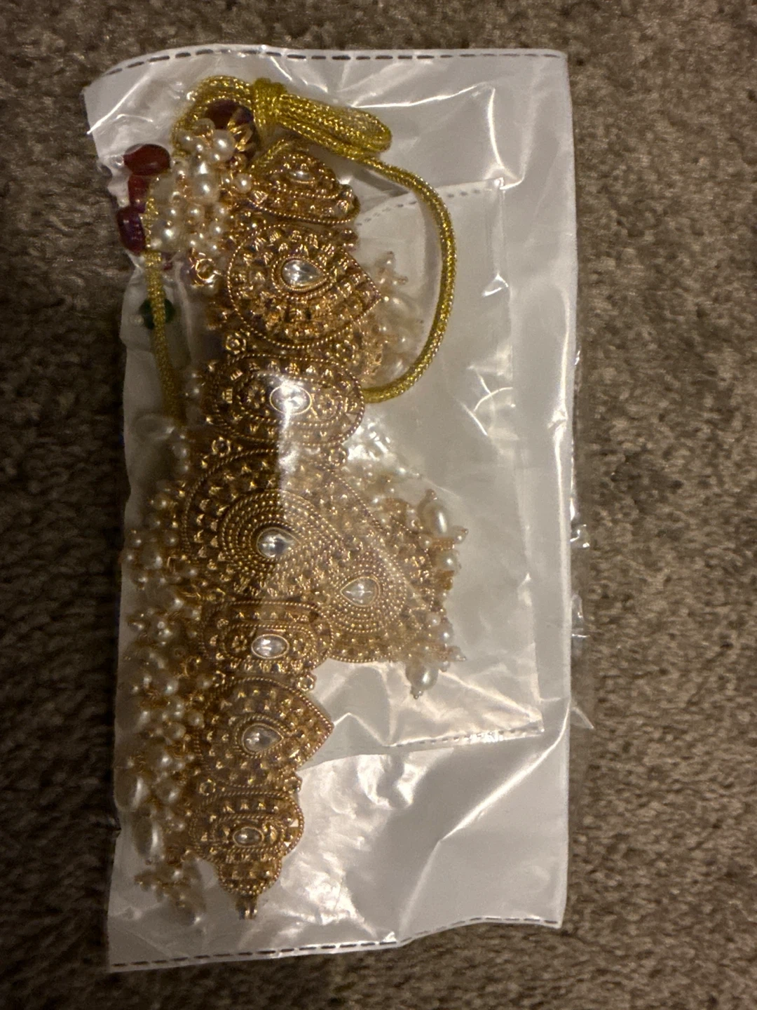 This is a beautiful gold-tone statement necklace set, complete with matching earrings. It's adorned with intricate detailing and faux pearls. This set is perfect for adding a touch of elegance to any special occasion outfit!