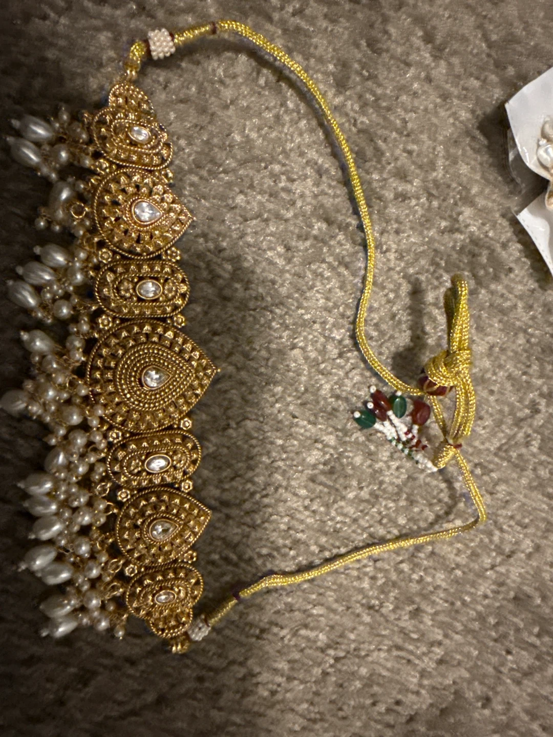 This is a beautiful gold-tone statement necklace set, complete with matching earrings. It's adorned with intricate detailing and faux pearls. This set is perfect for adding a touch of elegance to any special occasion outfit!