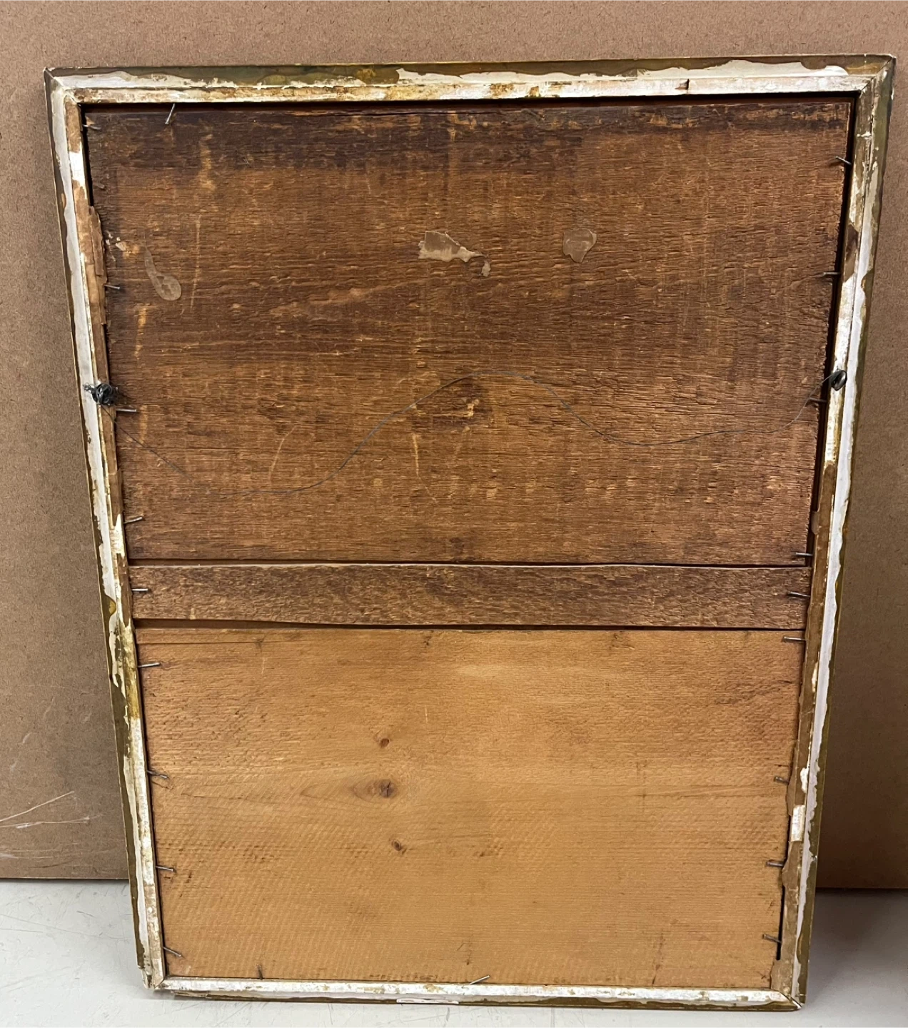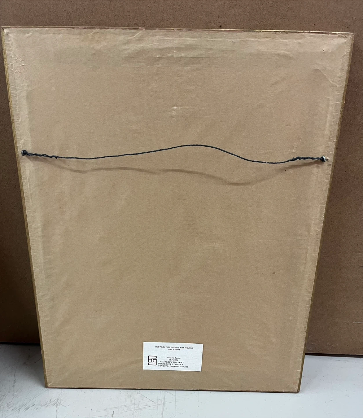 Framed artwork depicts Jesus and a weeping woman. The piece is matted and housed in a decorative gold-toned frame. Restoration of Fine Art Works is indicated on the backing paper.