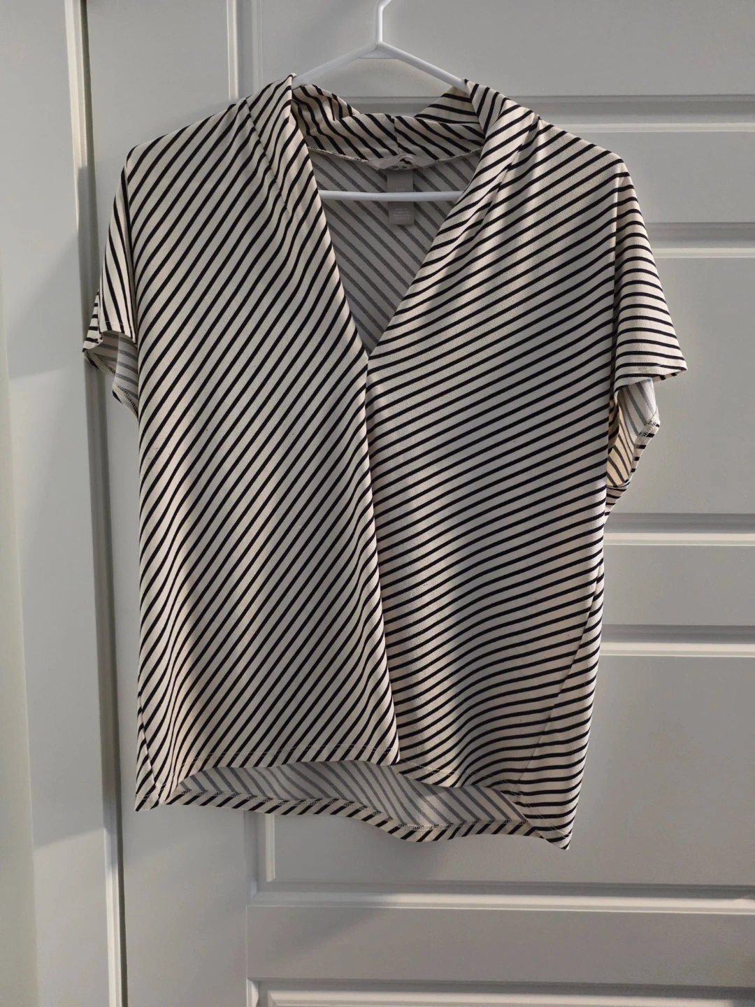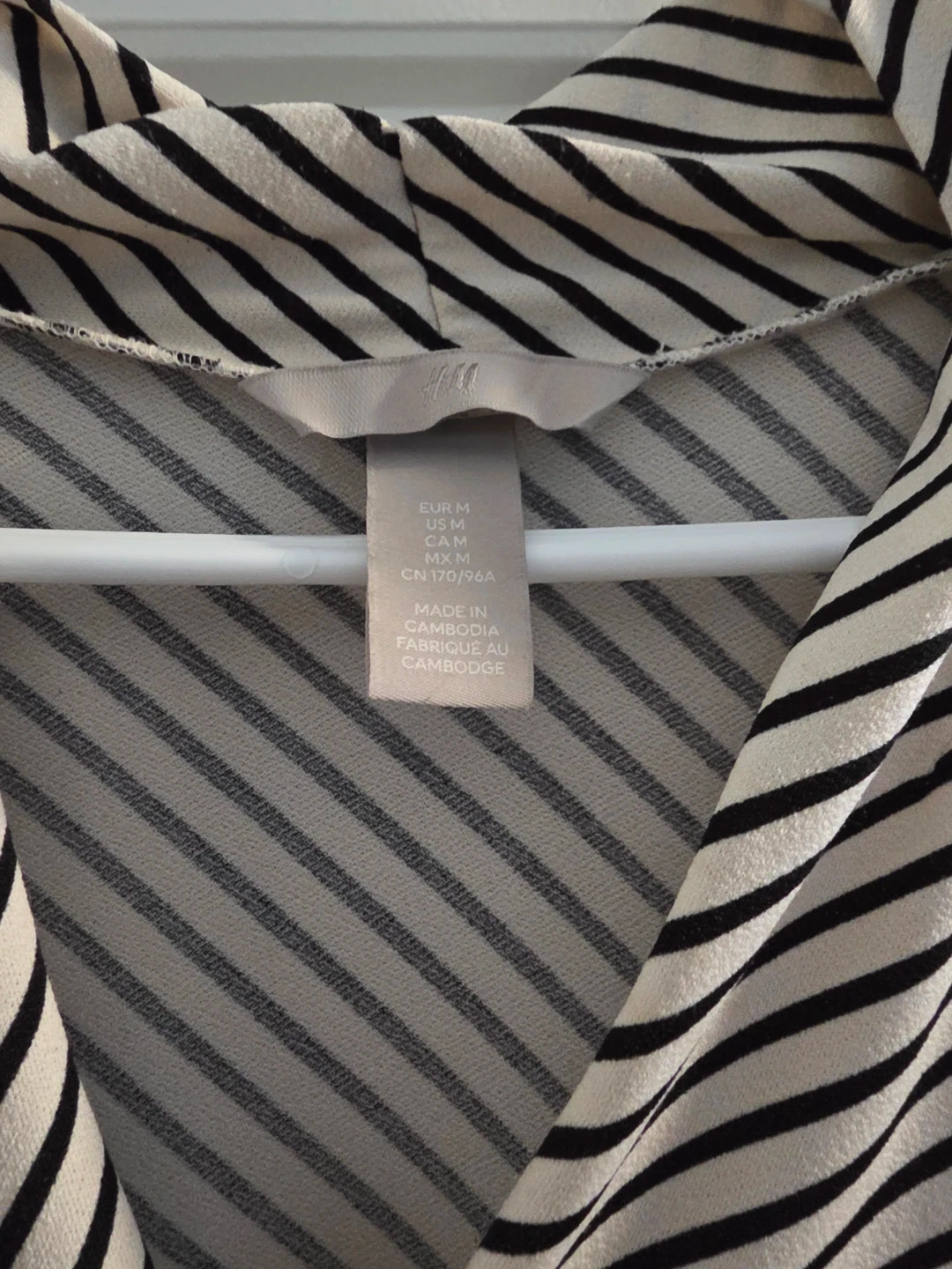 This is an H&M V-neck blouse with a black and white stripe pattern. It's a size medium (EUR M, US M, CAM M). Made in Cambodia.