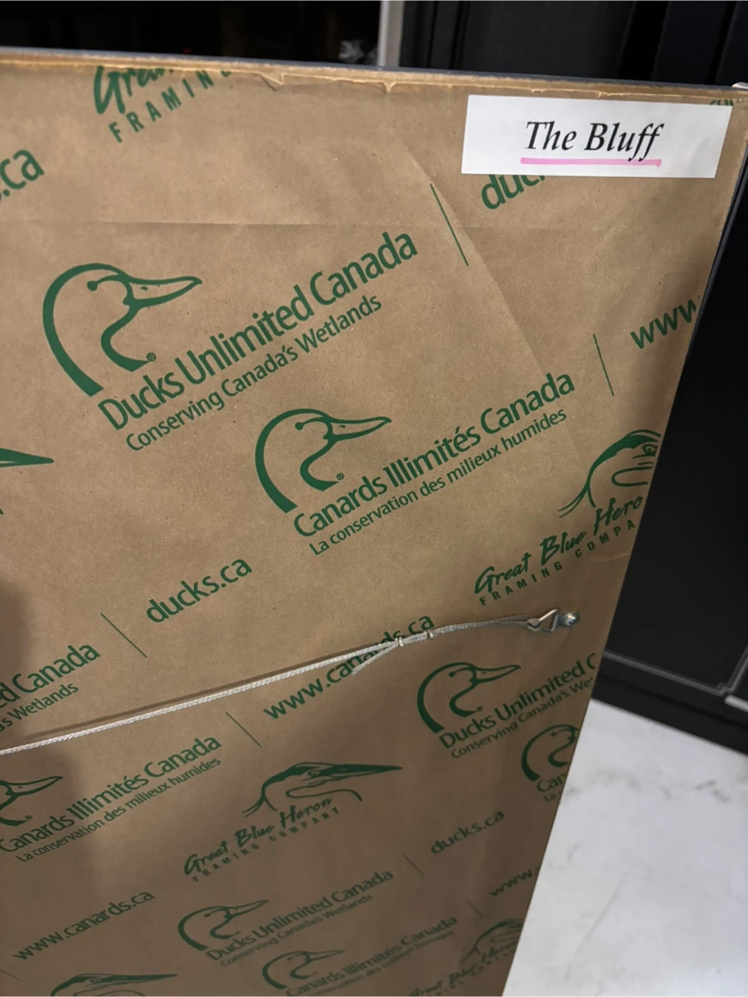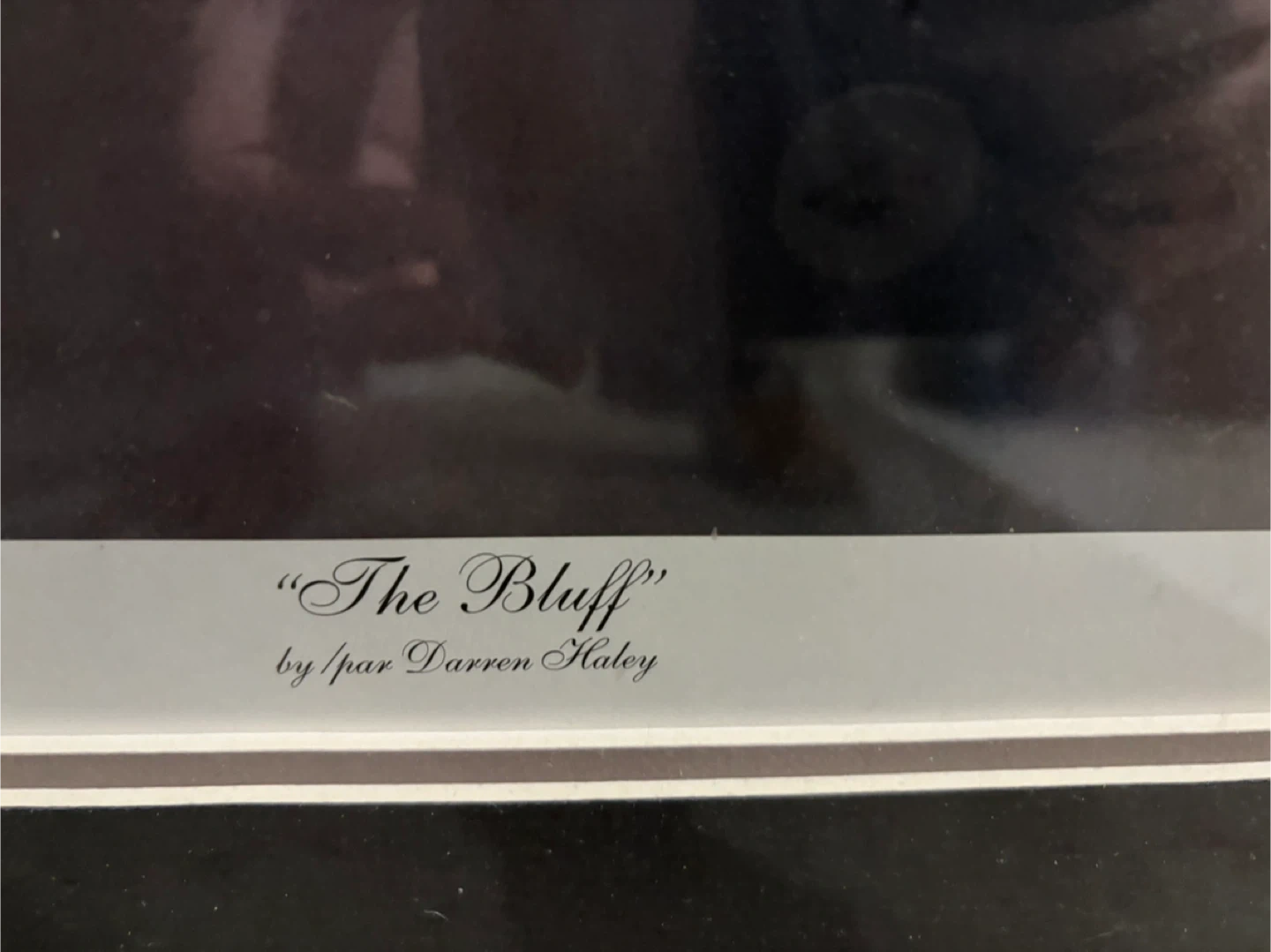 This framed art print is titled "The Bluff" and features an elephant. It's a limited edition, numbered 310 out of 3000. The piece is signed by the artist, Darren Haley. Includes backing from Ducks Unlimited Canada and measures 42” x 34.25”
