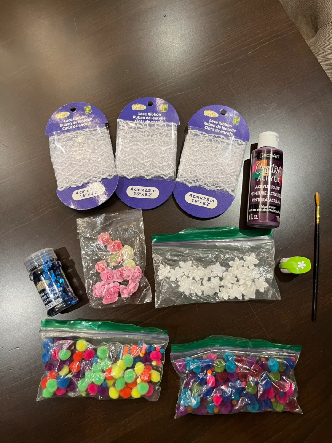 Includes various craft supplies such as lace ribbon, felt squares, pom poms, beads, and acrylic paint. Lots of fun materials for crafting projects!