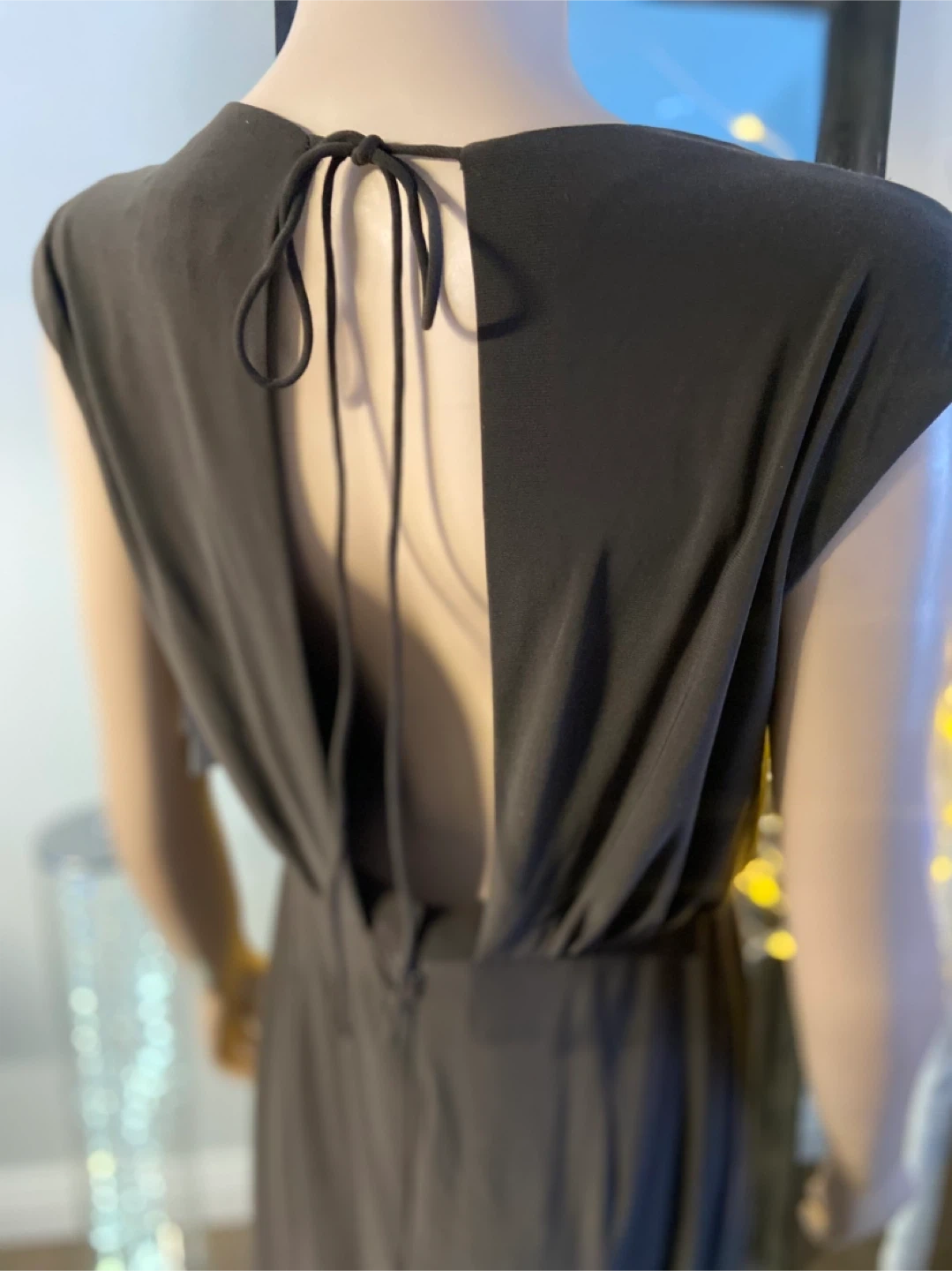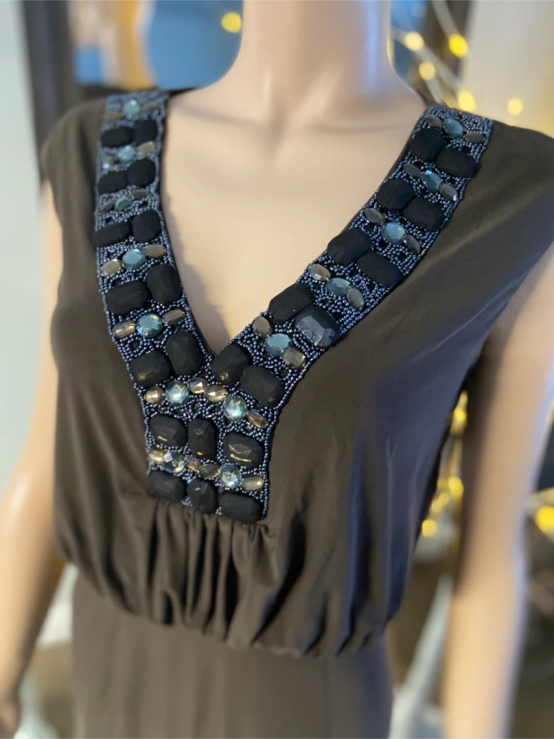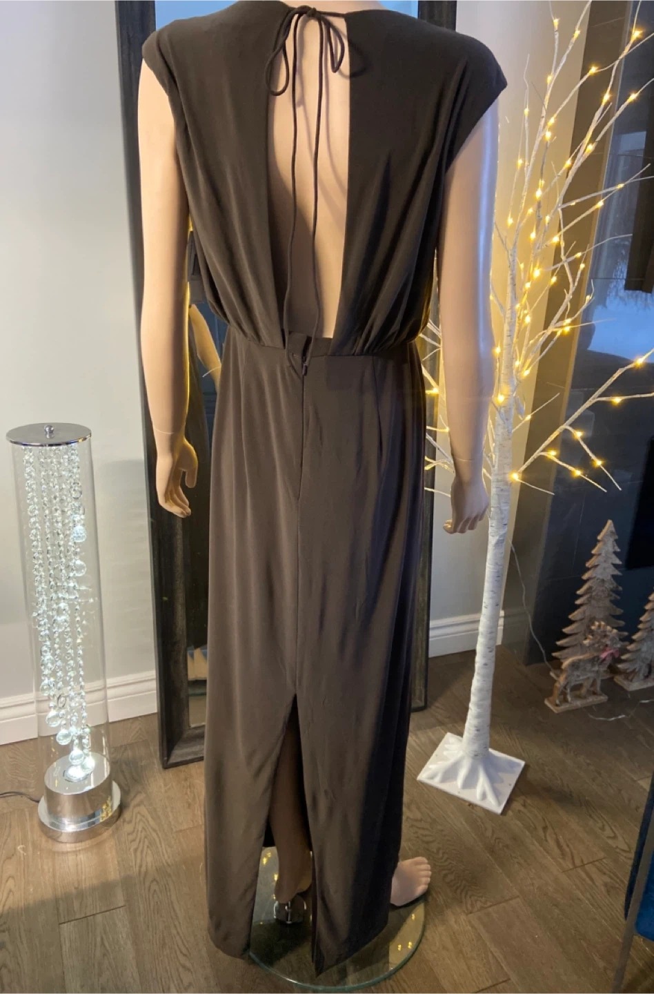 This elegant brown stretch maxi dress features a V-neckline with striking embellishments. It has cap sleeves and a cinched waist for a flattering silhouette. The back has a tie detail and a discreet slit at the hem.