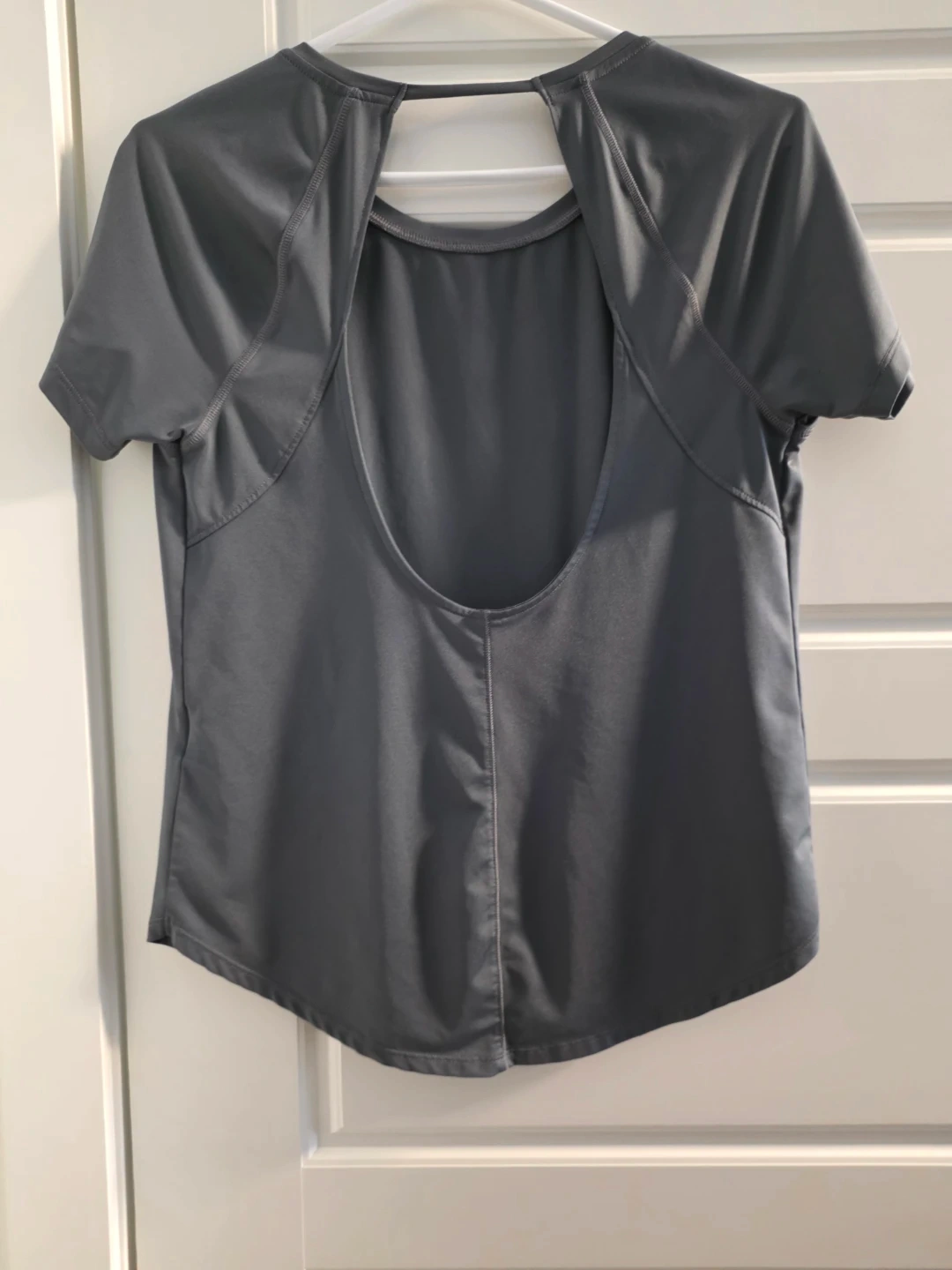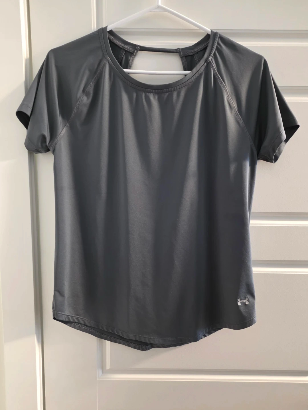 This Under Armour t-shirt is a breathable, lightweight grey athletic top. It features a stylish open-back design and short sleeves. Perfect for workouts or casual wear!