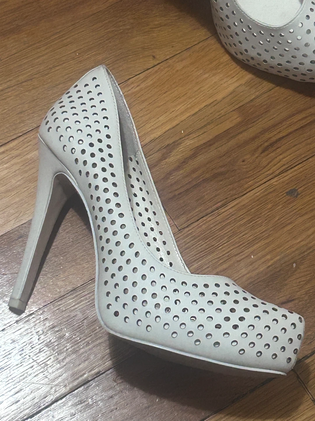 BCBGeneration white heels with a perforated design. These stylish pumps feature a stiletto heel. Material appears to be faux leather.